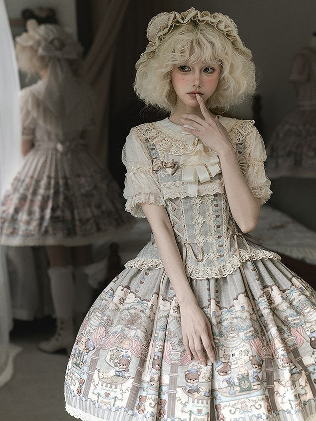 青と白のオールドスクールロリータファッションドレス 蝶結びディテール JSK セット