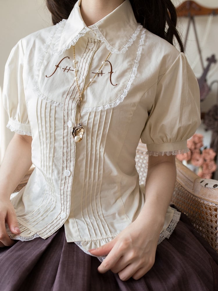 ベージュのプリーツボディスショートパフスリーブシャツ