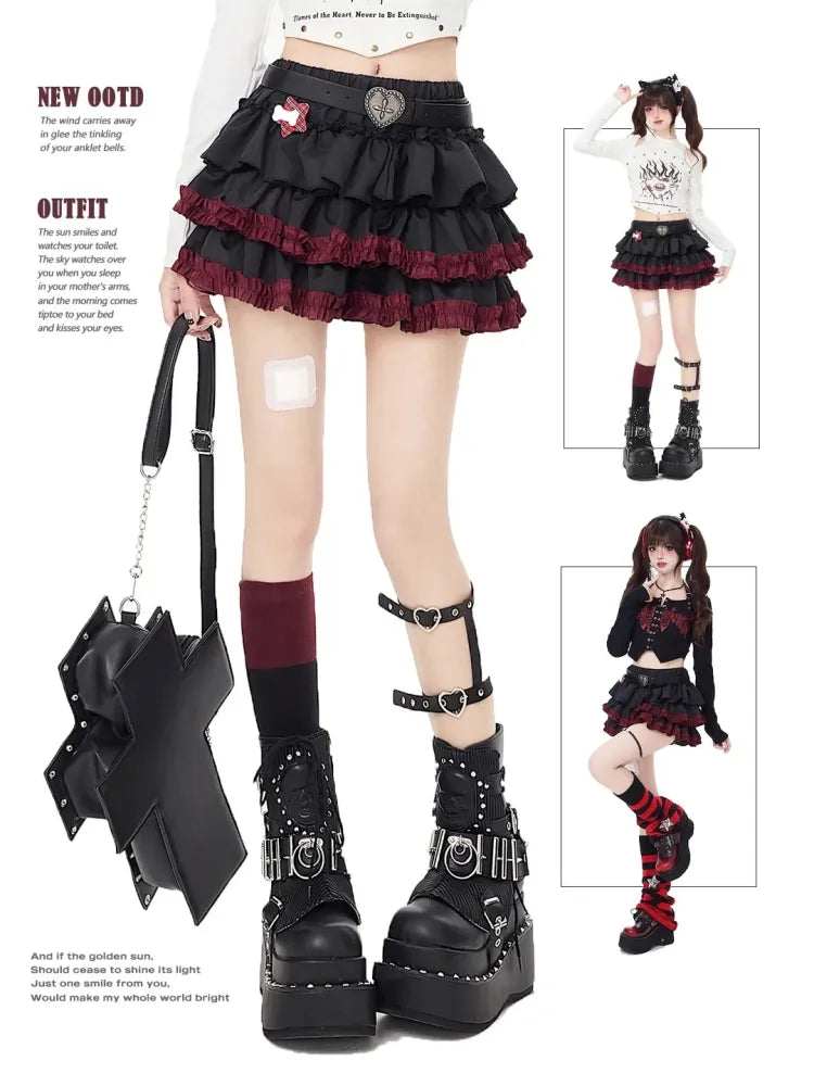 フリル裾のブラックパンクティアードスカート(ウエストベルト付き)