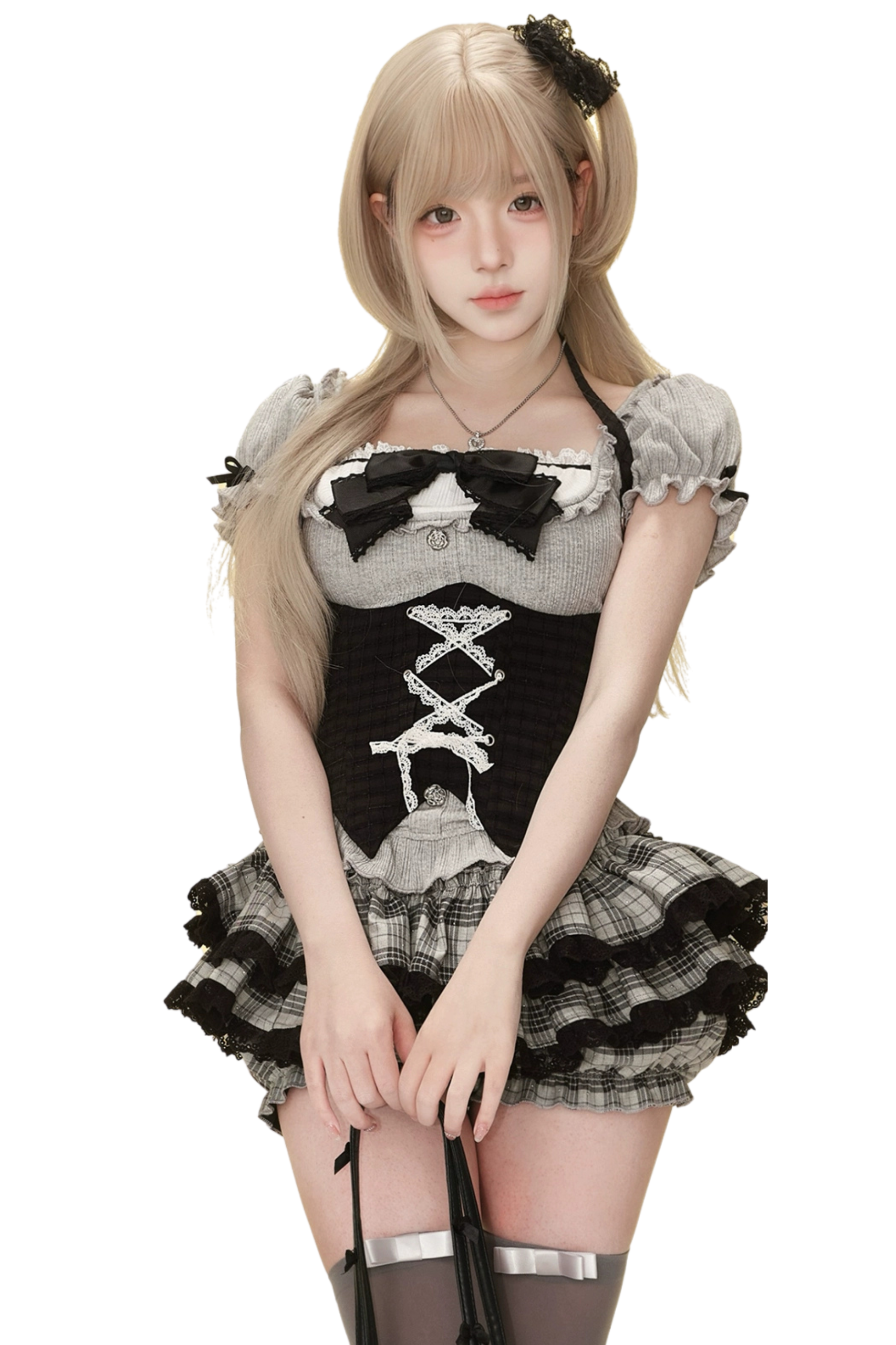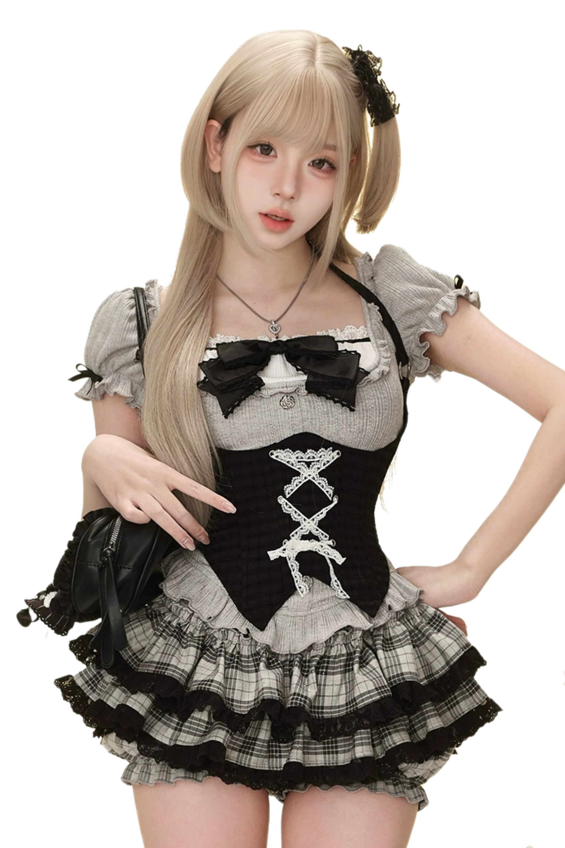 ❤ムーンライトシークレットランゲージトップ + ブラックウエストベルト + チェック柄ケーキスカート❤