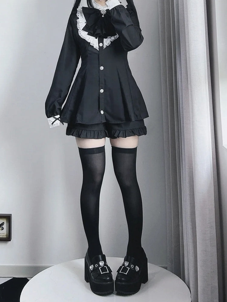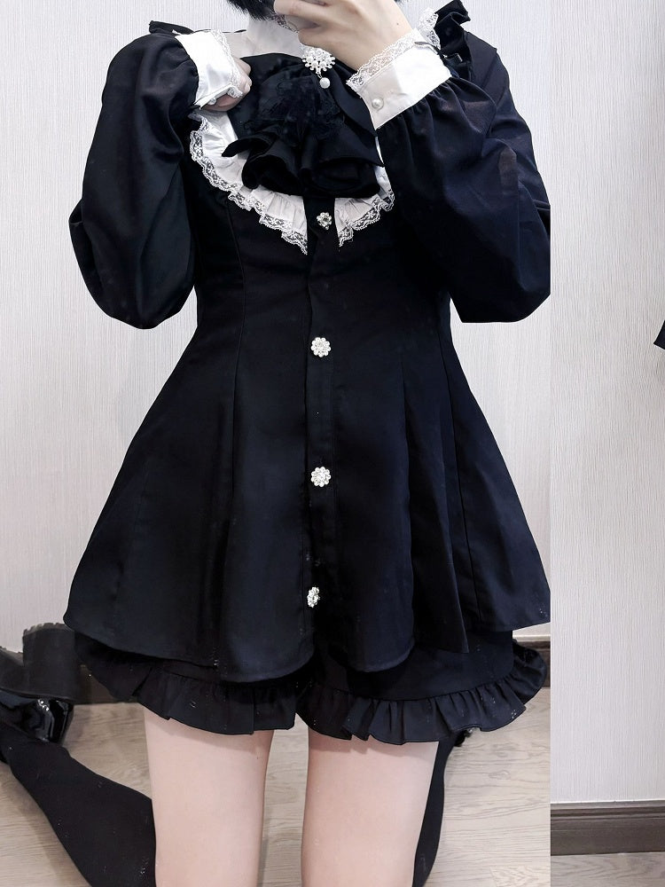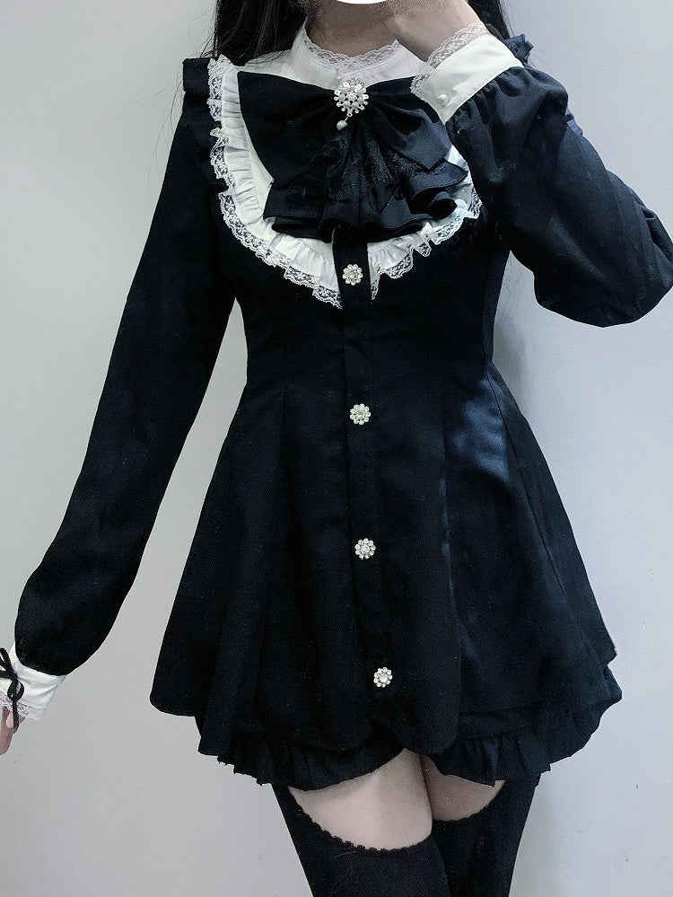 ジライケイ ブラック 取り外し可能なジャボカラーと大きなリボン 長袖ミニドレス+ショーツセット