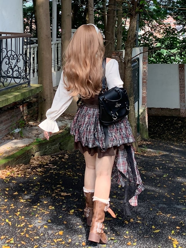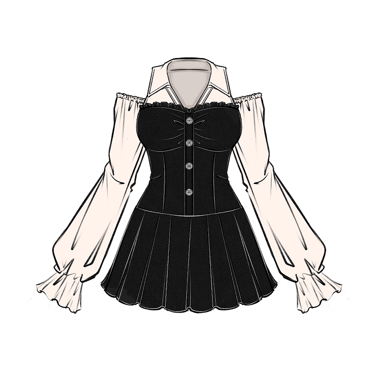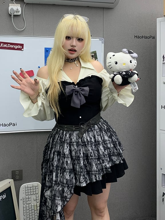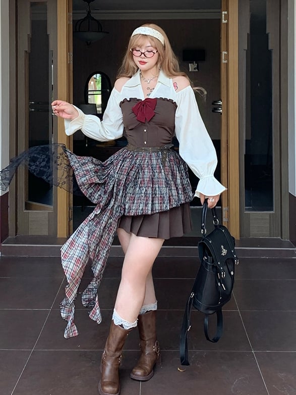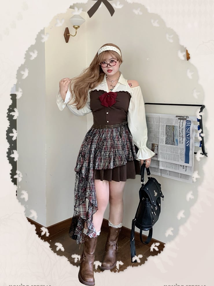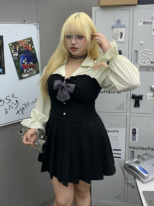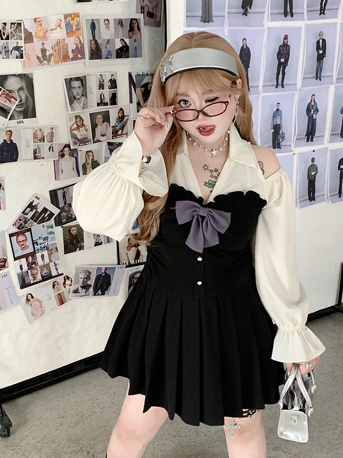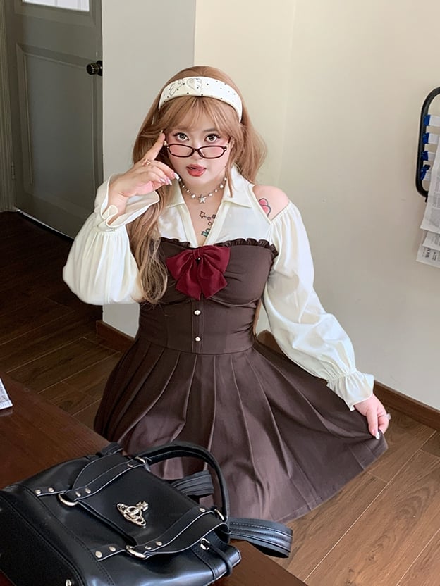 Plus Size Black / Brown Dress Pleated Skirt with Cutout Shoulder and Bishop Sleeves