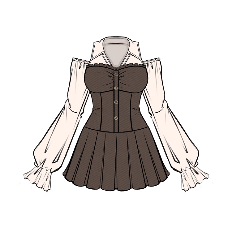 Bishop Dress Pleated Cutout Shoulder and Skirt / Sleeves Plus Size Black Brown with