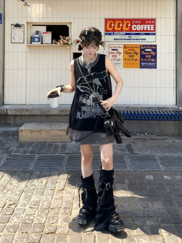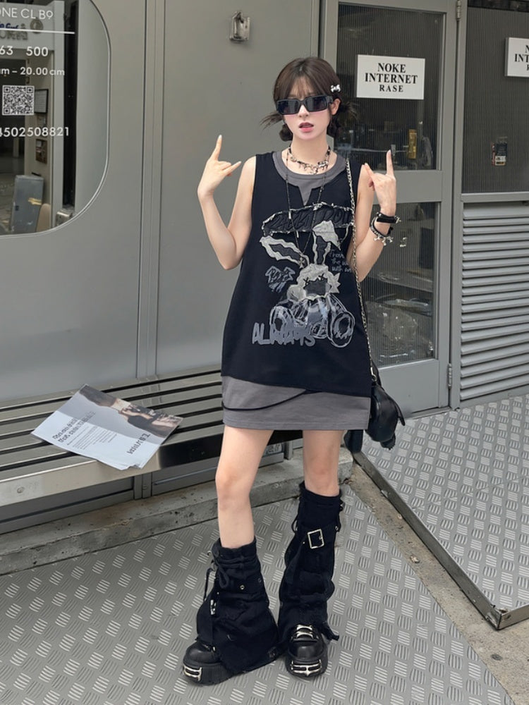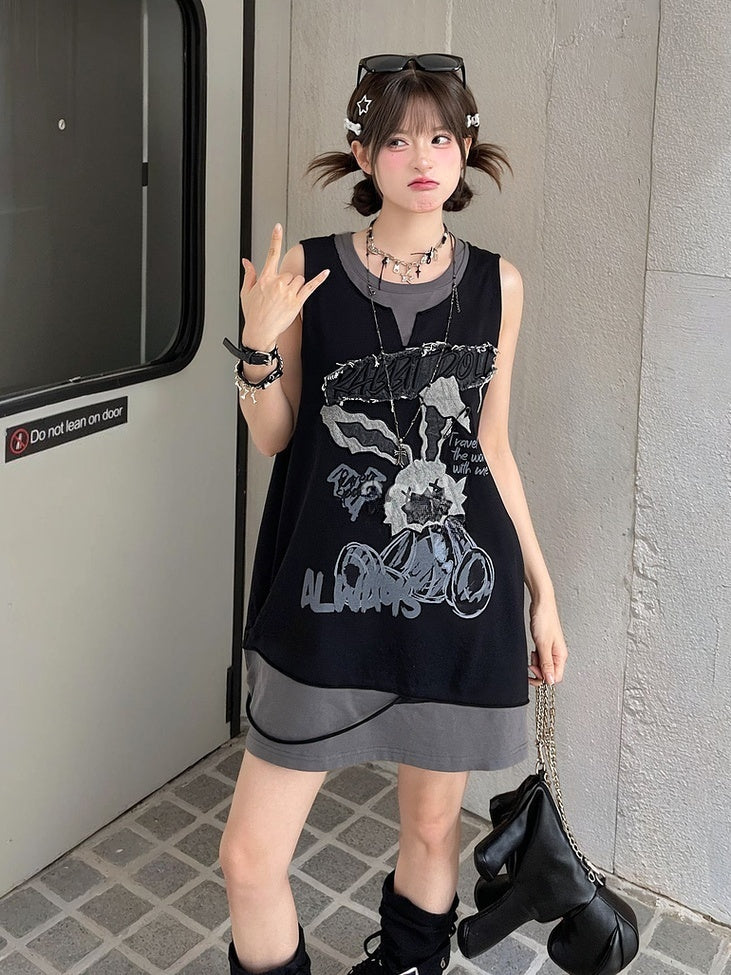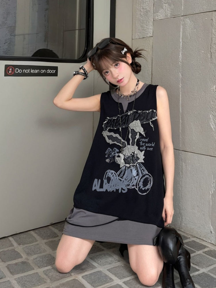 ブラック&グレーのウサギ柄レターアップリケのほろ苦いタンクトップフェイクツーピース