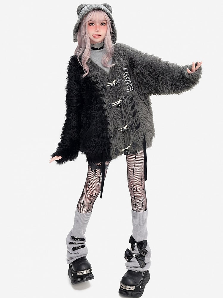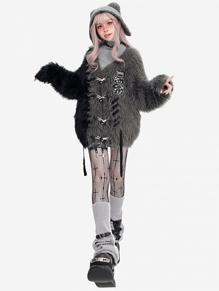 ブラック&グレーのカラーブロックパンクベアアップリケルーズカーディガン