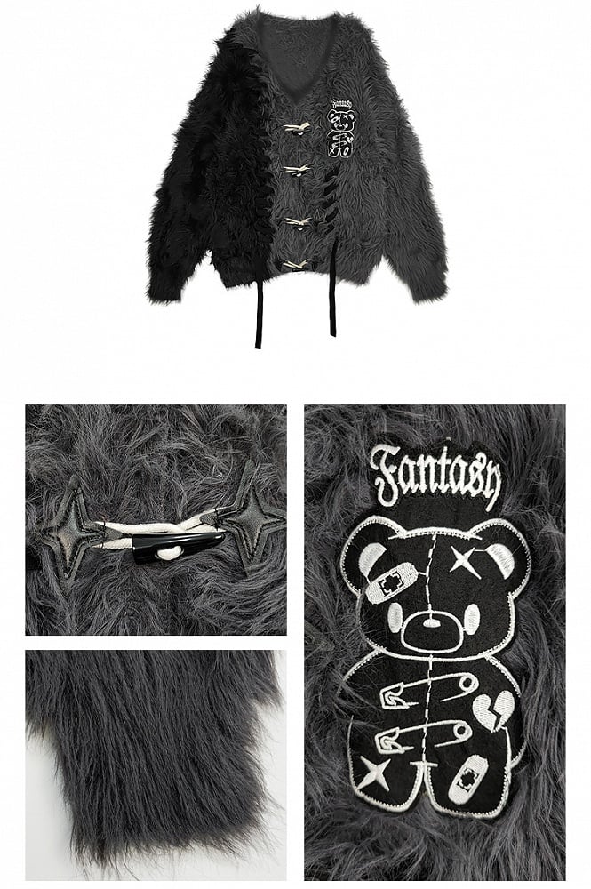 ブラックとグレーのカラーブロックカーディガン。キュートなパンク風ベアのアップリケとゆったりとしたフィット感が特徴。遊び心とスタイリッシュさを兼ね備えたスタイルにぴったりです。