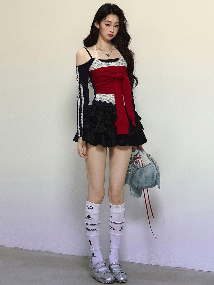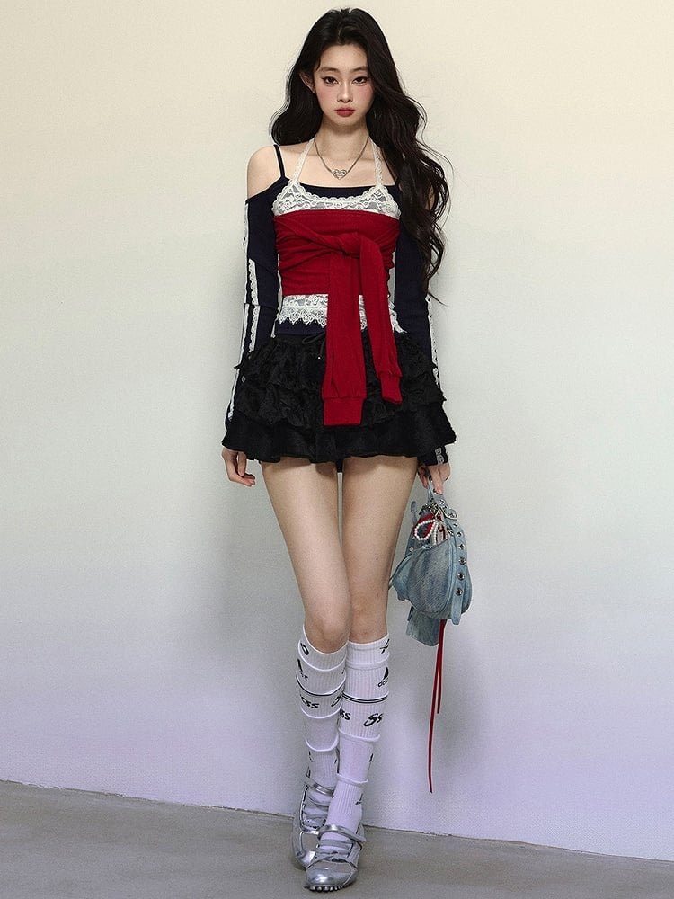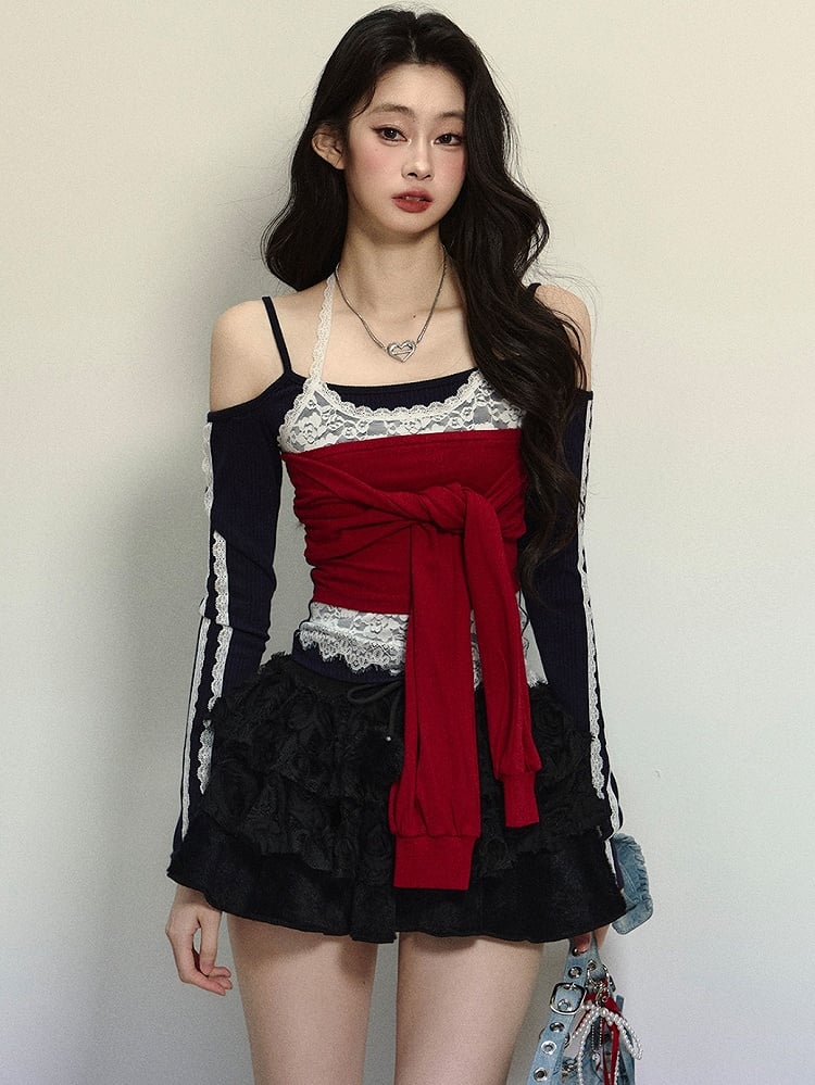 黒と赤の大胆なネクタイアクセントのホルターネック長袖トップス