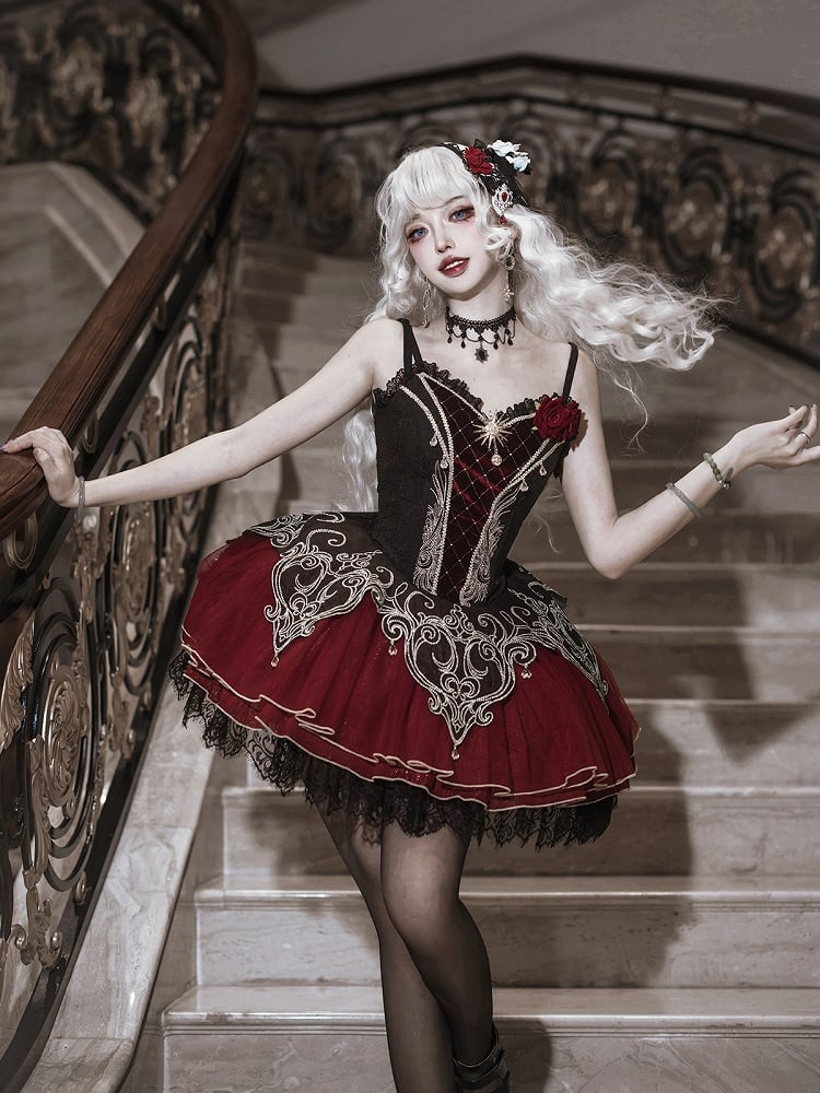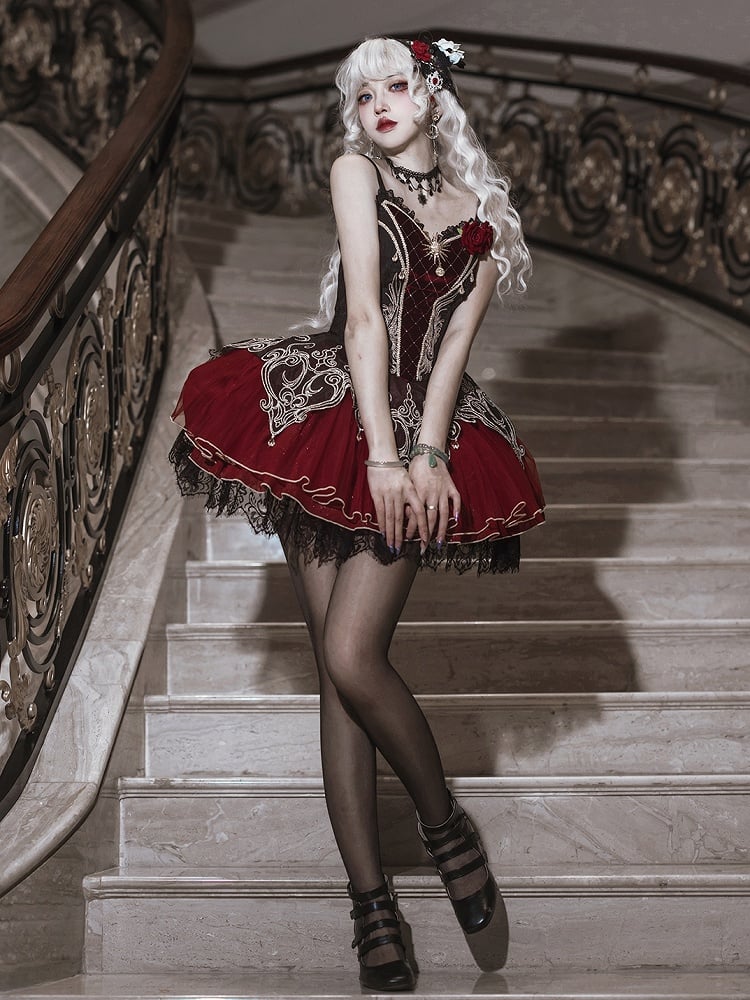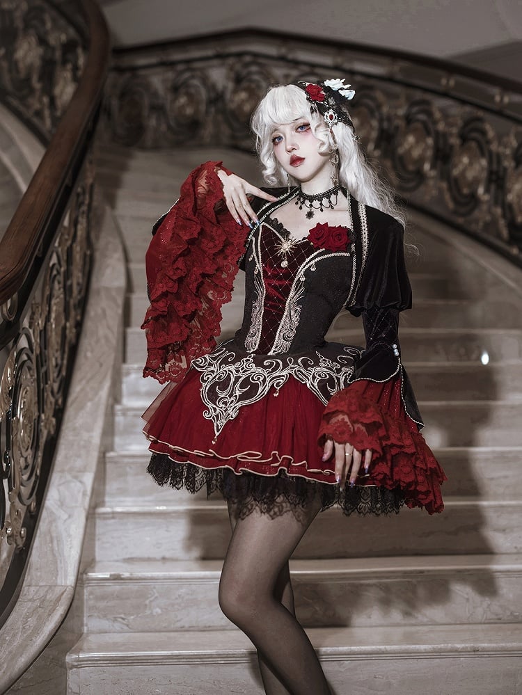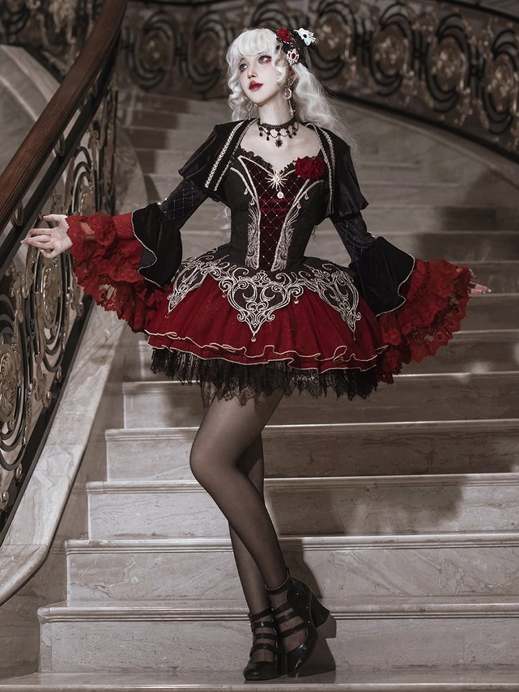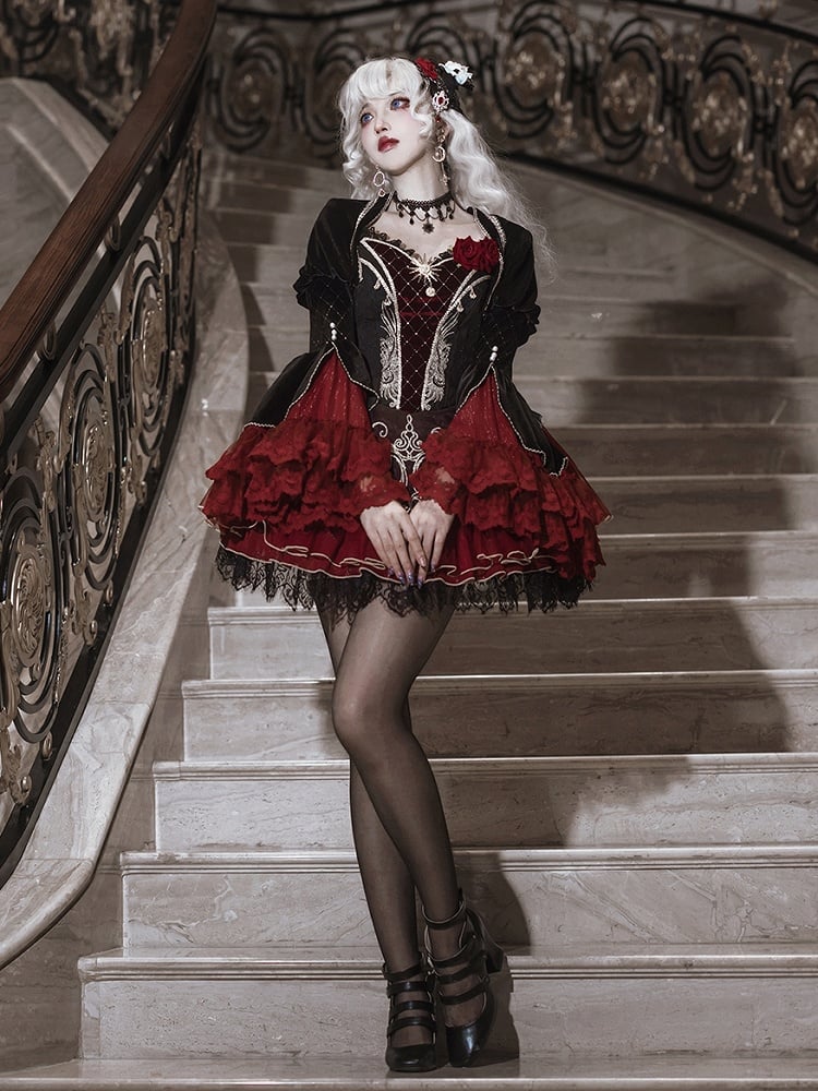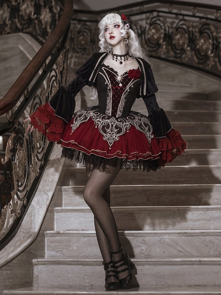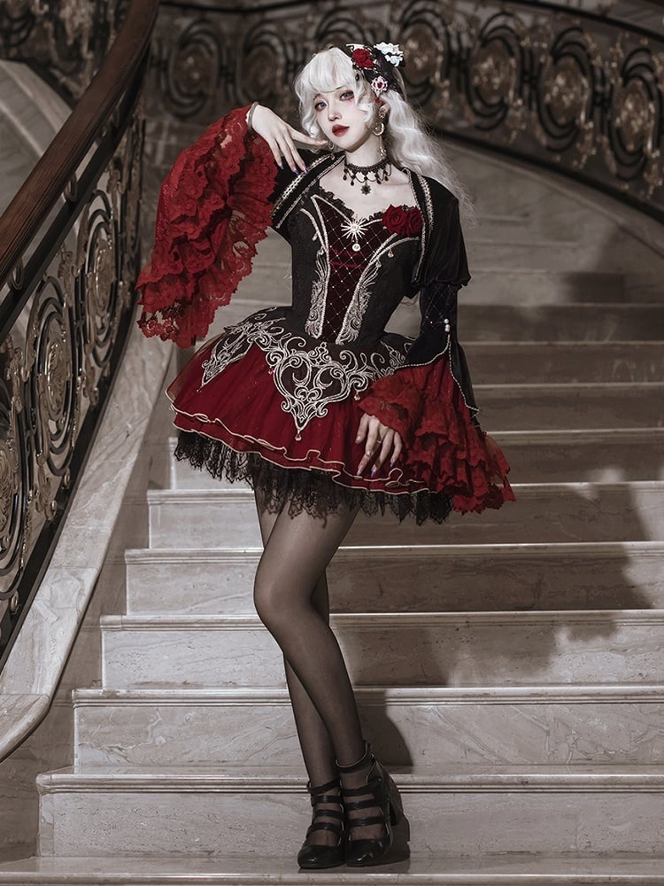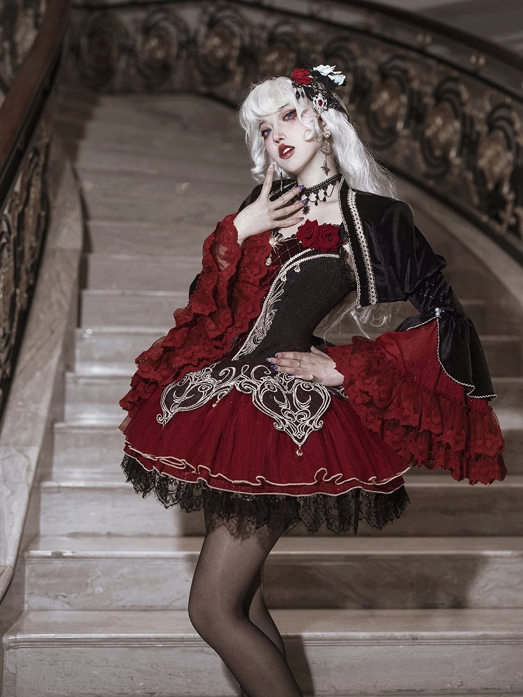 黒と赤のゴシックヴァンパイアの細いショルダーストラップのロリータJSK + ロングベルスリーブボレロ