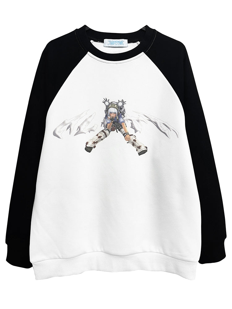 黒と白のカラーブロックサイバーパンクガールグラフィックスウェットシャツ