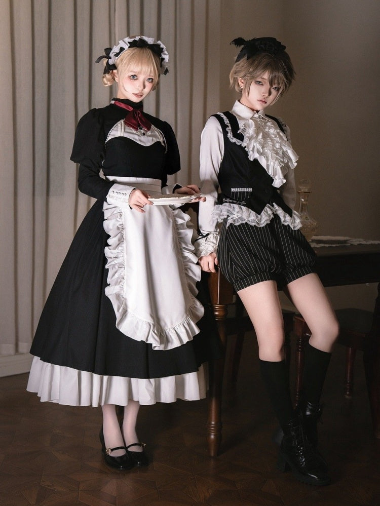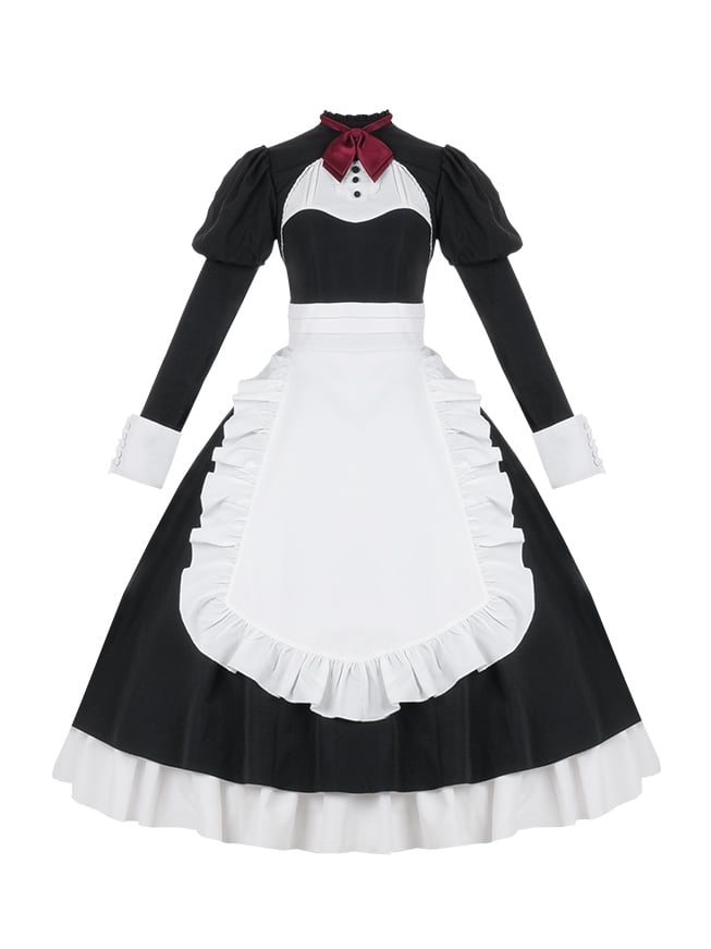 黒と白のジュリエットスリーブメイドエプロンウエストロリータワンピース
