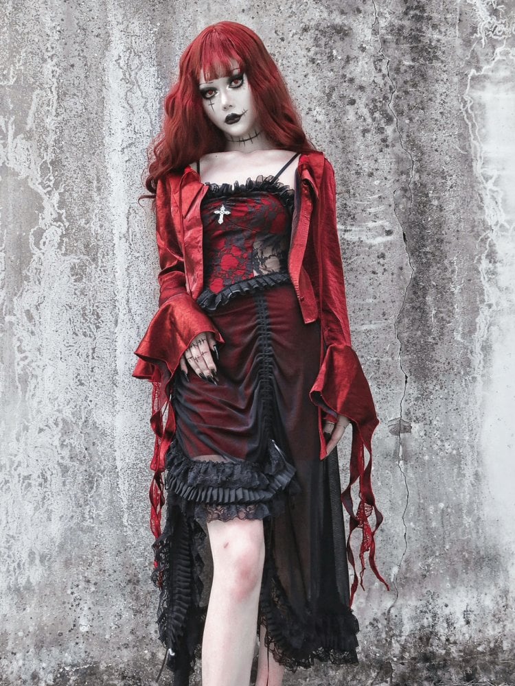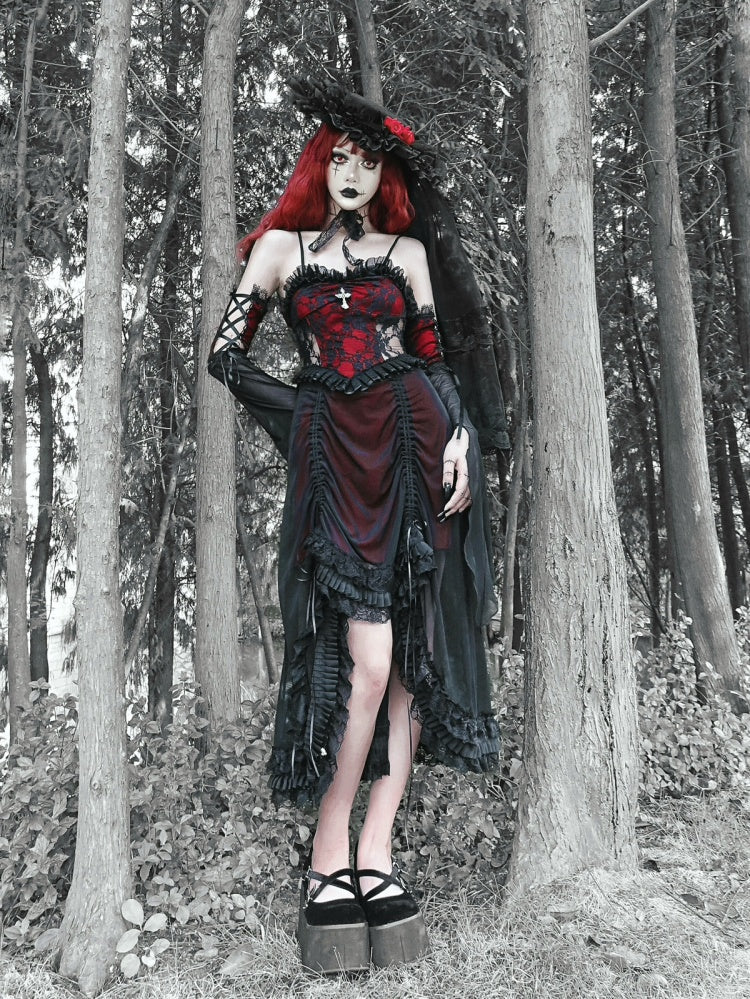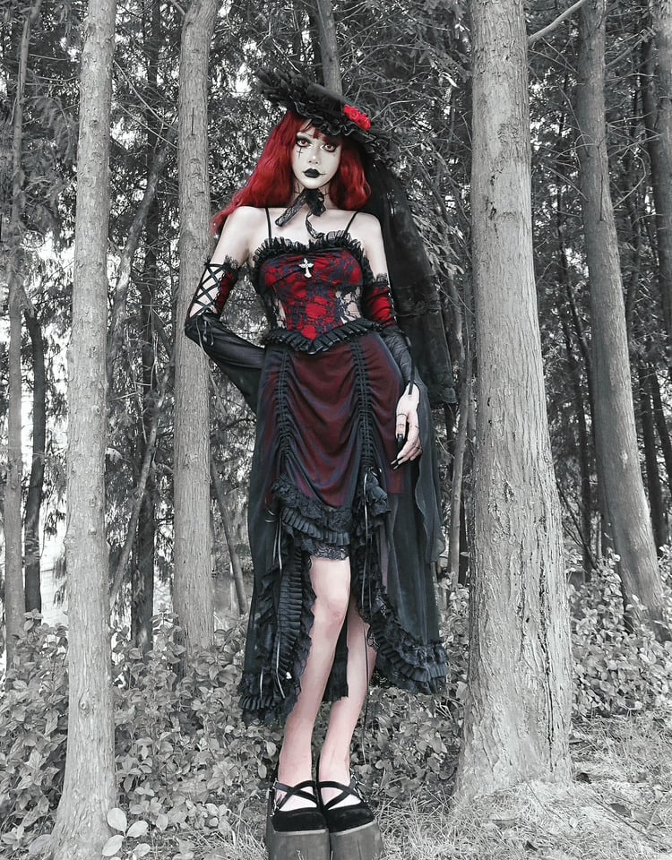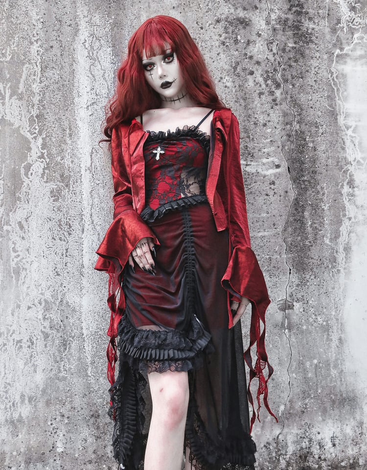 ブラックとワインレッドのヴァンパイアゴシックドレス、ドローストリングレースドレス、リストカフスセットで、ダークでありながらもチャーミングな装いを。ゴシックなシーンにぴったりの、魅力的なレースドレスとリストカフスで、あなたの内なるヴァンパイアを解き放ちましょう。
