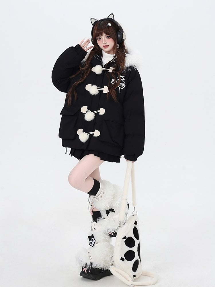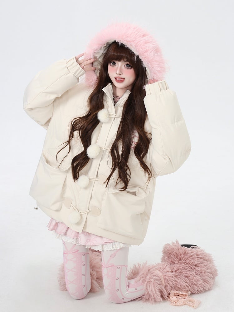 ブラックアプリコットフリース裏地フェイクファートリムフード付きコート