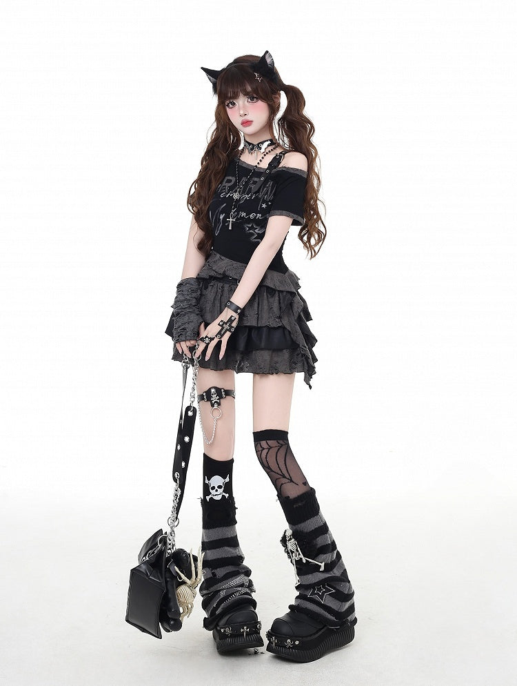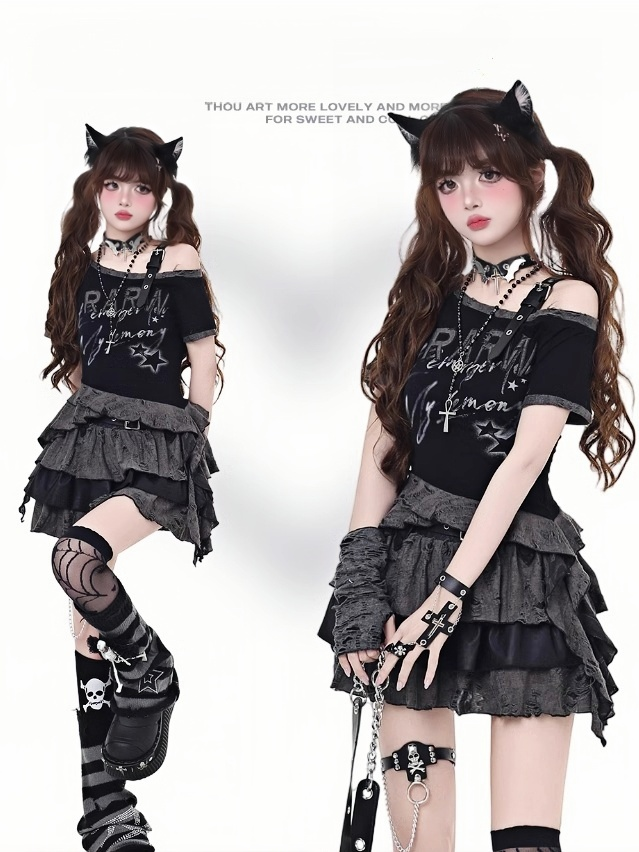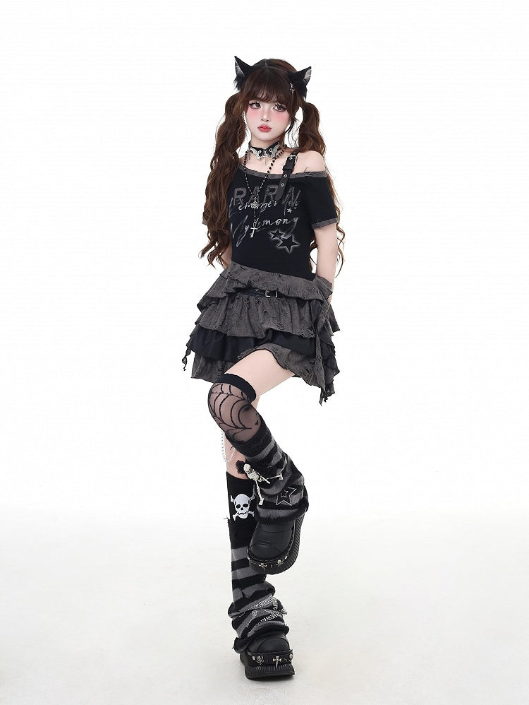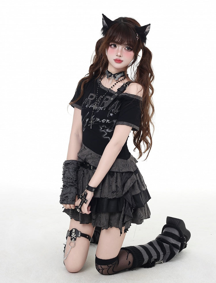 ブラックのアシンメトリーネックラインとバックルヘムストラップ、ダメージ加工の穴グラフィックTシャツ