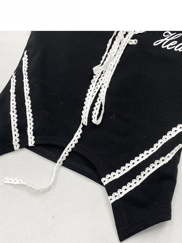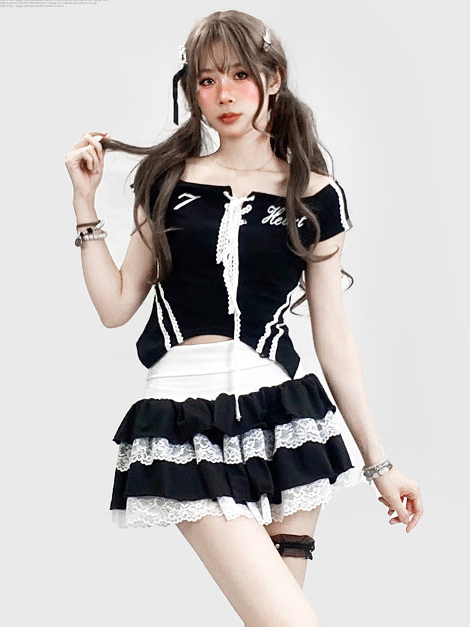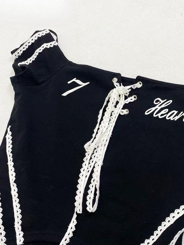 レースアップディテールとレタープリントが特徴の、ほろ苦くてカワイイ、ブラックのオフショルダーネックライントップス