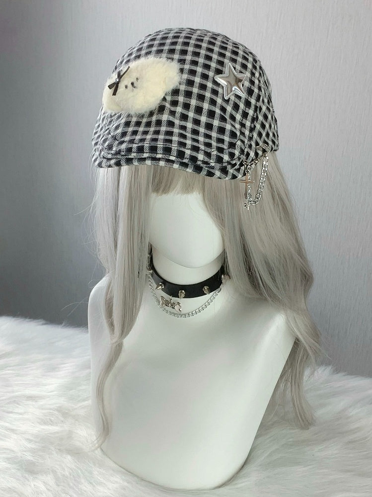 黒/茶色のチェック柄ベレー帽と子犬のぬいぐるみ