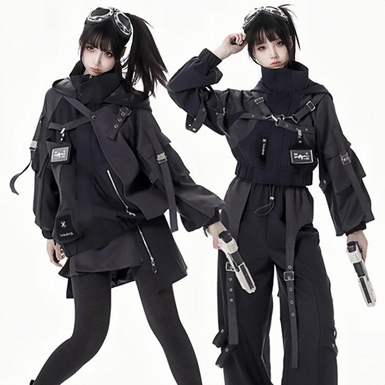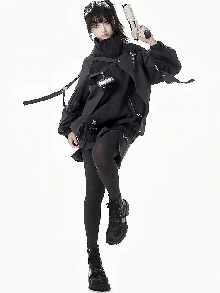 ブラックバックルストラップ、伸縮性のある袖口、ウエストフード付きジャケット、ショート/ロングバージョン