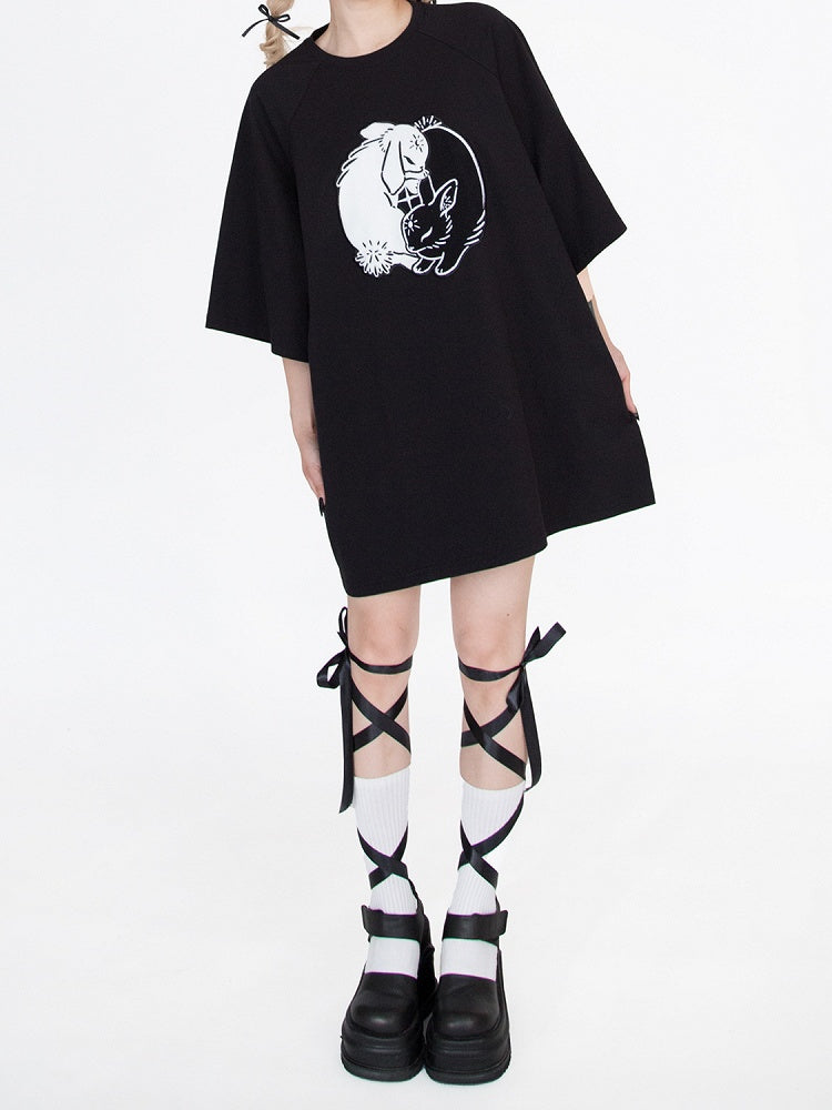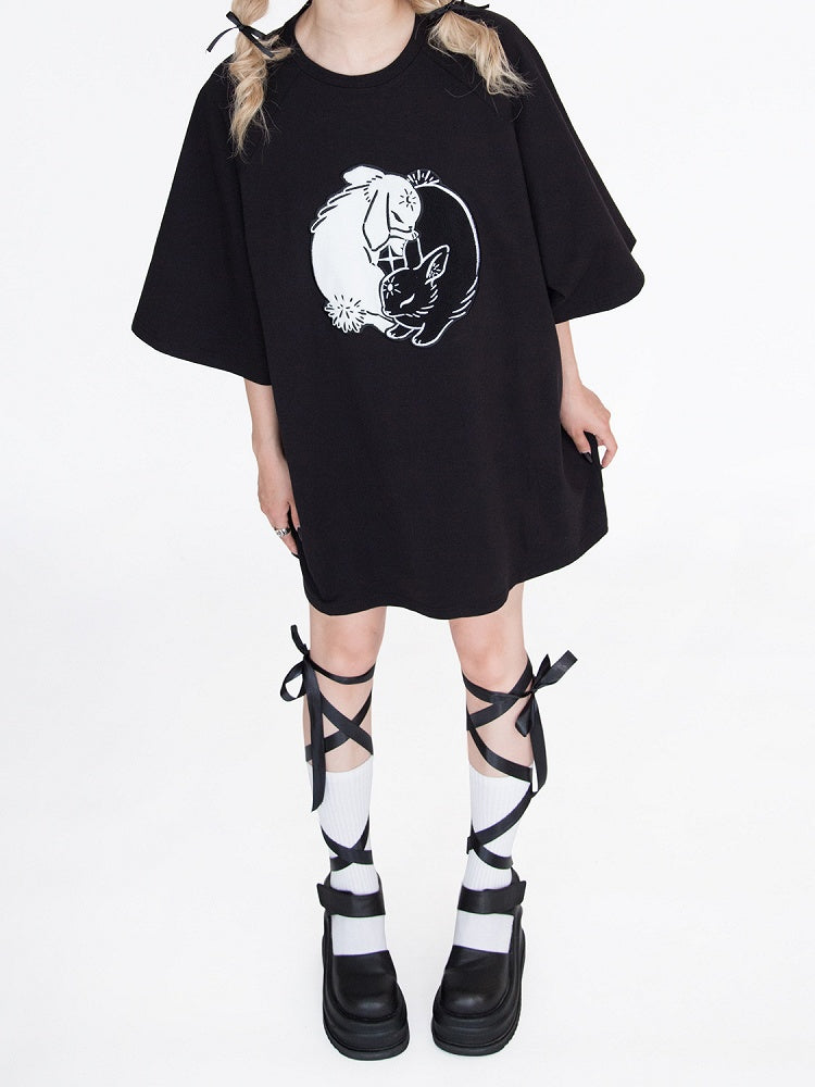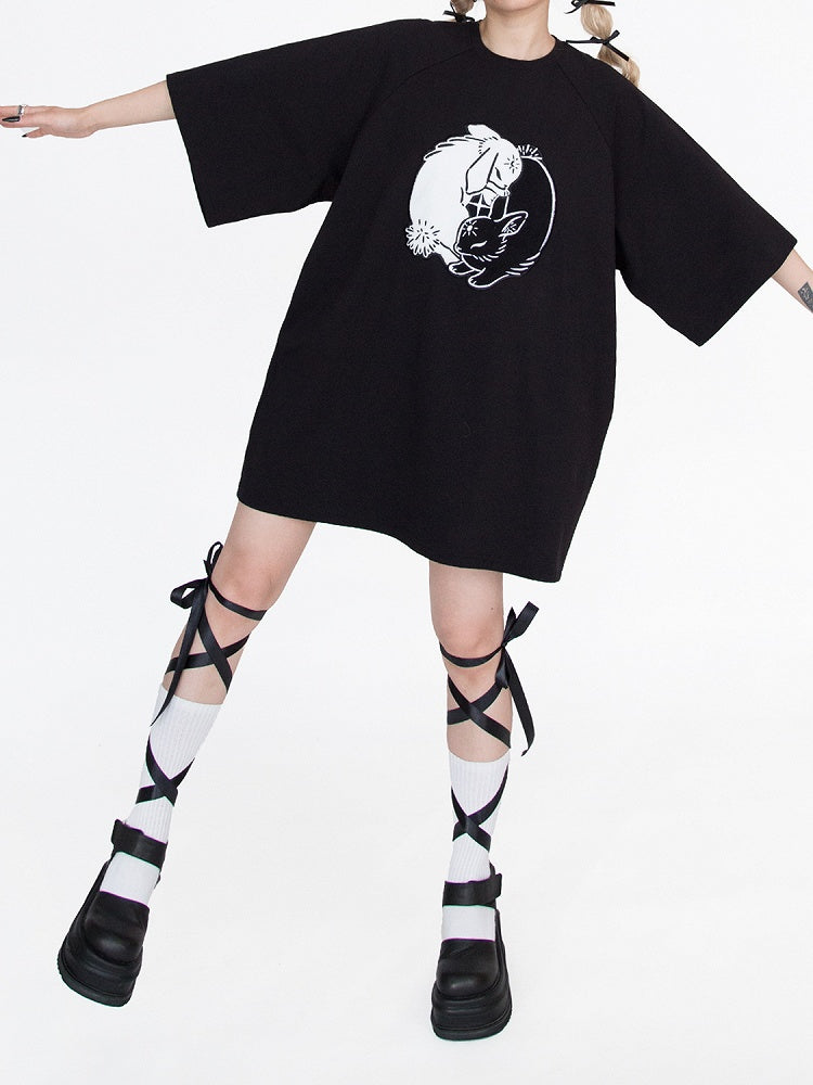 フロントにキュートな黒ウサギの刺繍が入ったオーバーサイズのTシャツ。どんなコーディネートにも可愛らしさをプラスしてくれるので、ワードローブにぜひ加えたい一枚です。