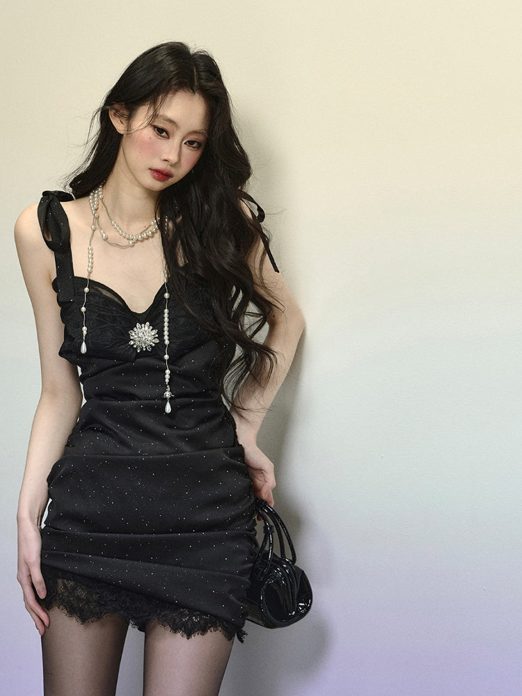 ブラックバタフライボディスラインストーン装飾ルーシュミニスリップドレス