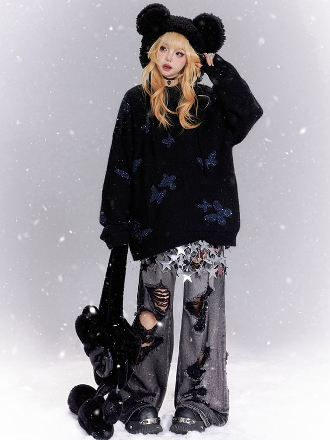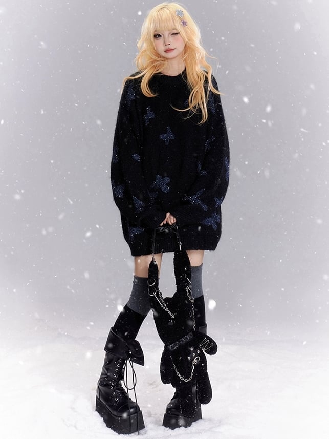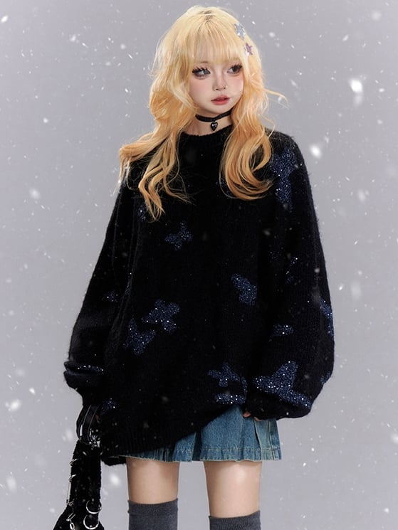 この愛らしいブラックのバタフライラインストーンルーズセーターは、どんな装いにも遊び心をプラスしてくれます。全体に散りばめられた繊細なバタフライラインストーンが、きっと目を引き、スタイルをワンランクアップさせてくれるでしょう。このユニークなセーターを着て、心地よくキュートな気分を味わいましょう。