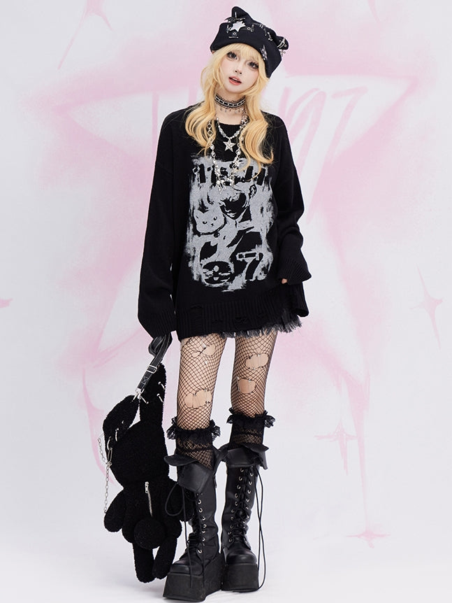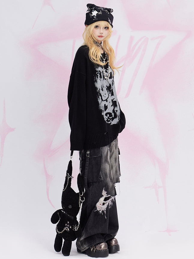 ダメージ加工のトリムとキュートな黒猫柄が特徴の、愛らしいセーター。ゆったりとしたトップスで、心地よくスタイリッシュに過ごしましょう!