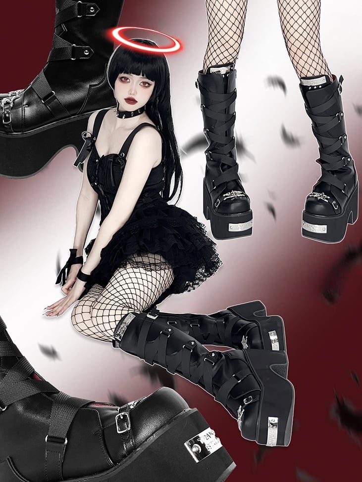 ブラック クリスクロスバックルストラップ プラットフォーム ブロックヒール ブーツ