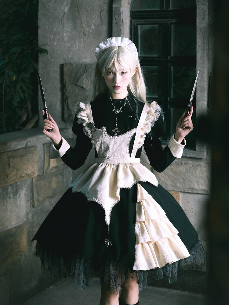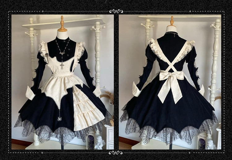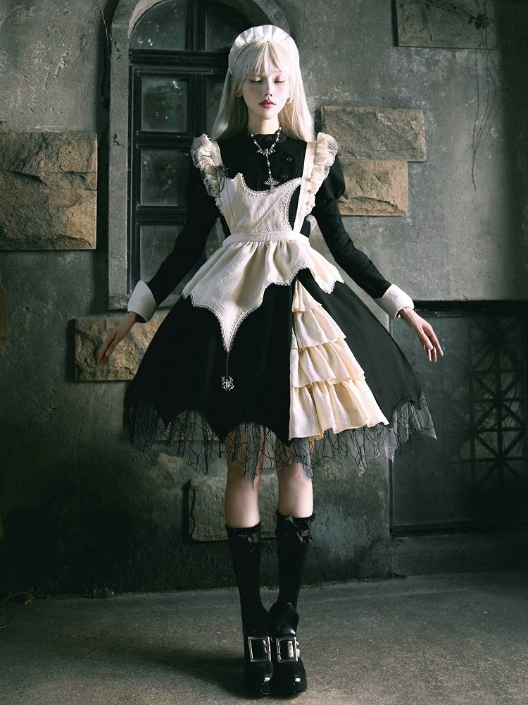 黒の曲線模様の蜘蛛の巣裾のダークメイドロリータドレス(ベージュのエプロン付き)