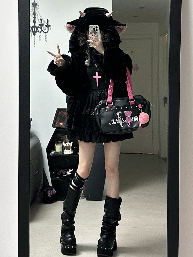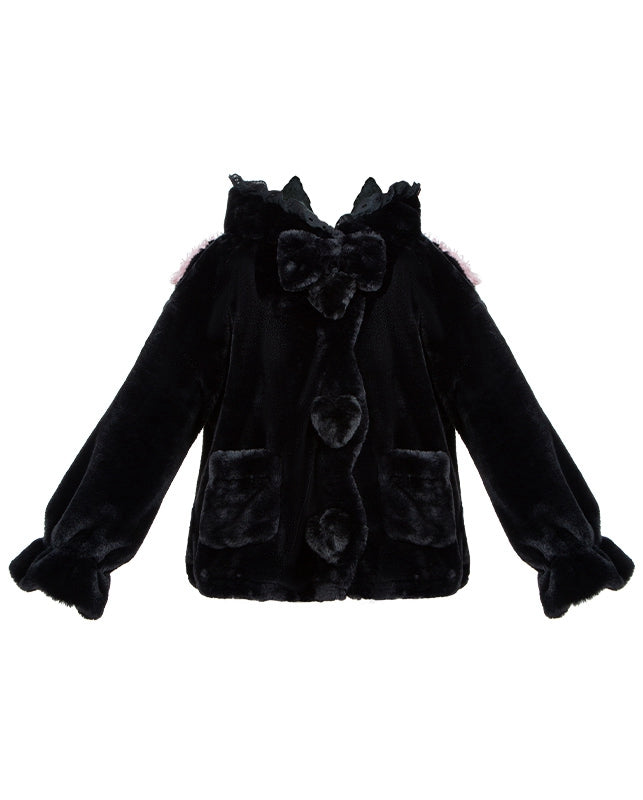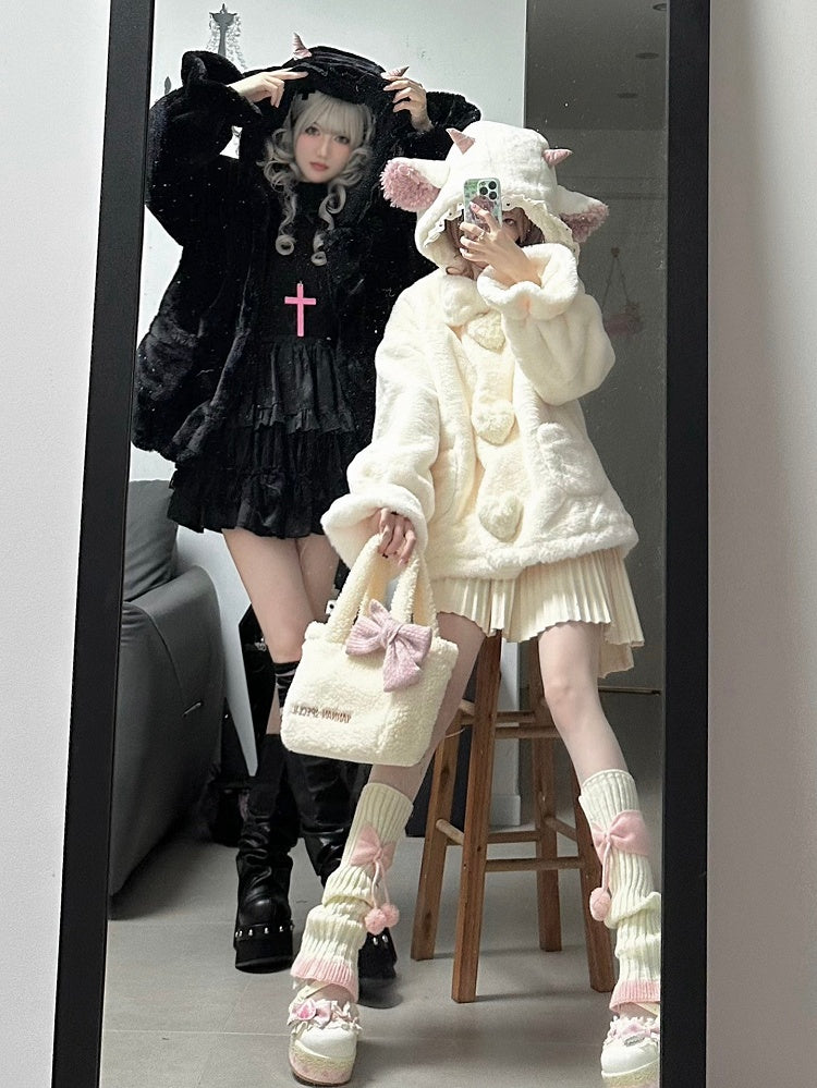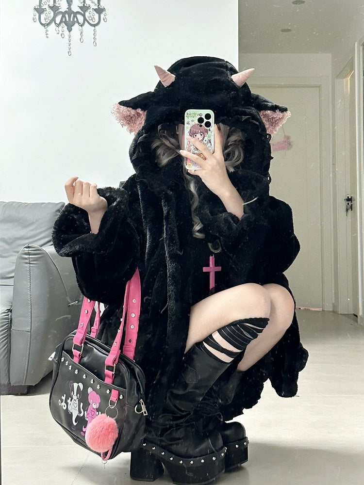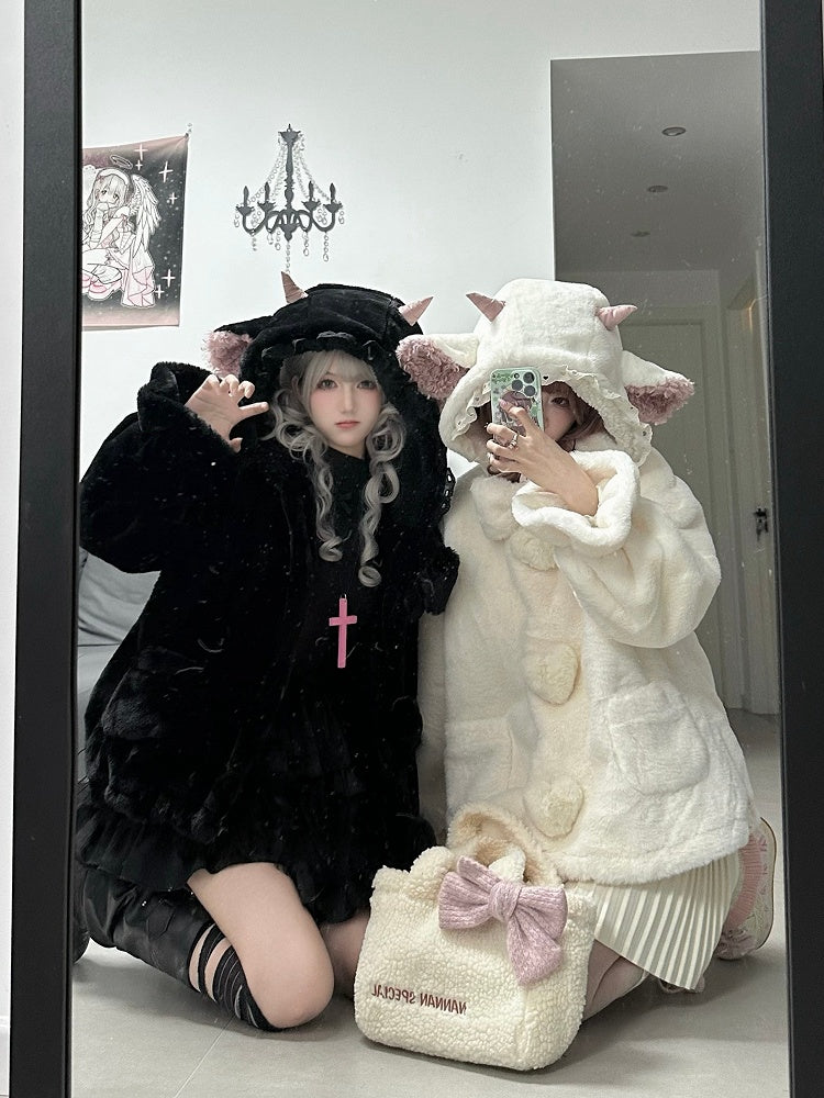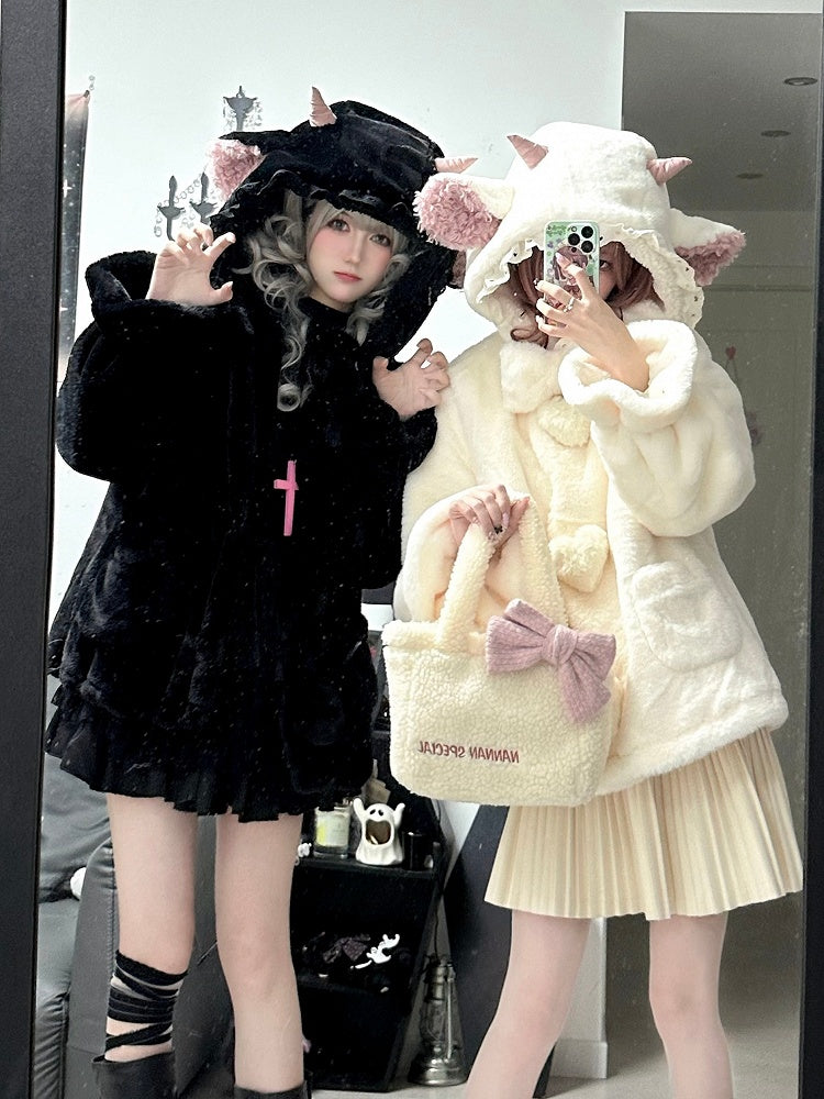 黒のキュートなラムの耳付きフード付き冬用着心地の良いプラッシュコート