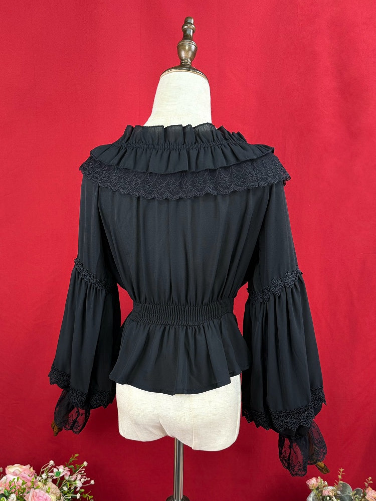 ブラックの伸縮性のあるネックラインのシフォンブラウス、スモック加工の伸縮性のあるウエスト