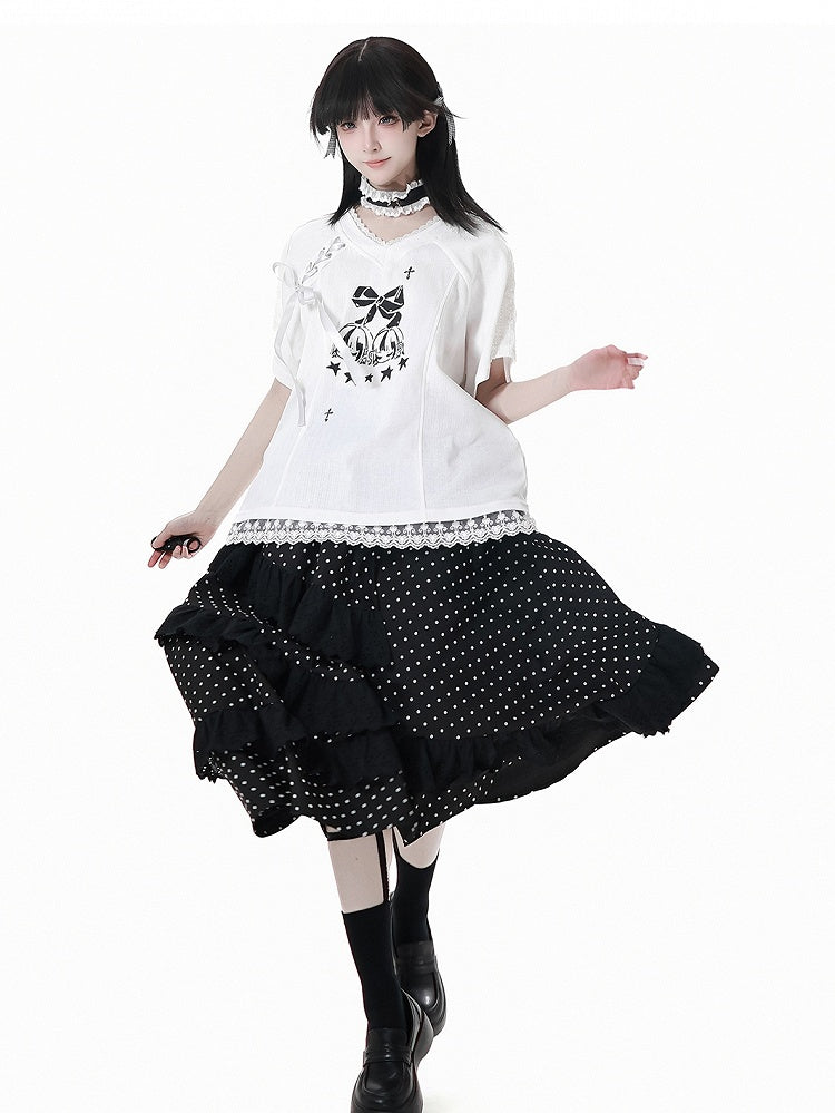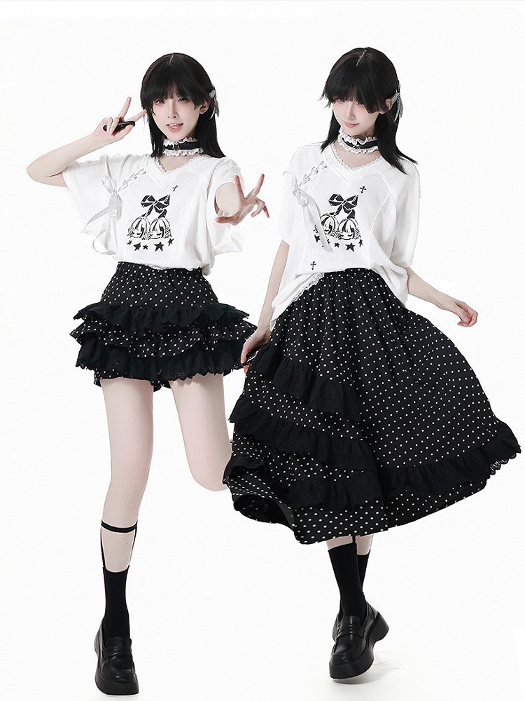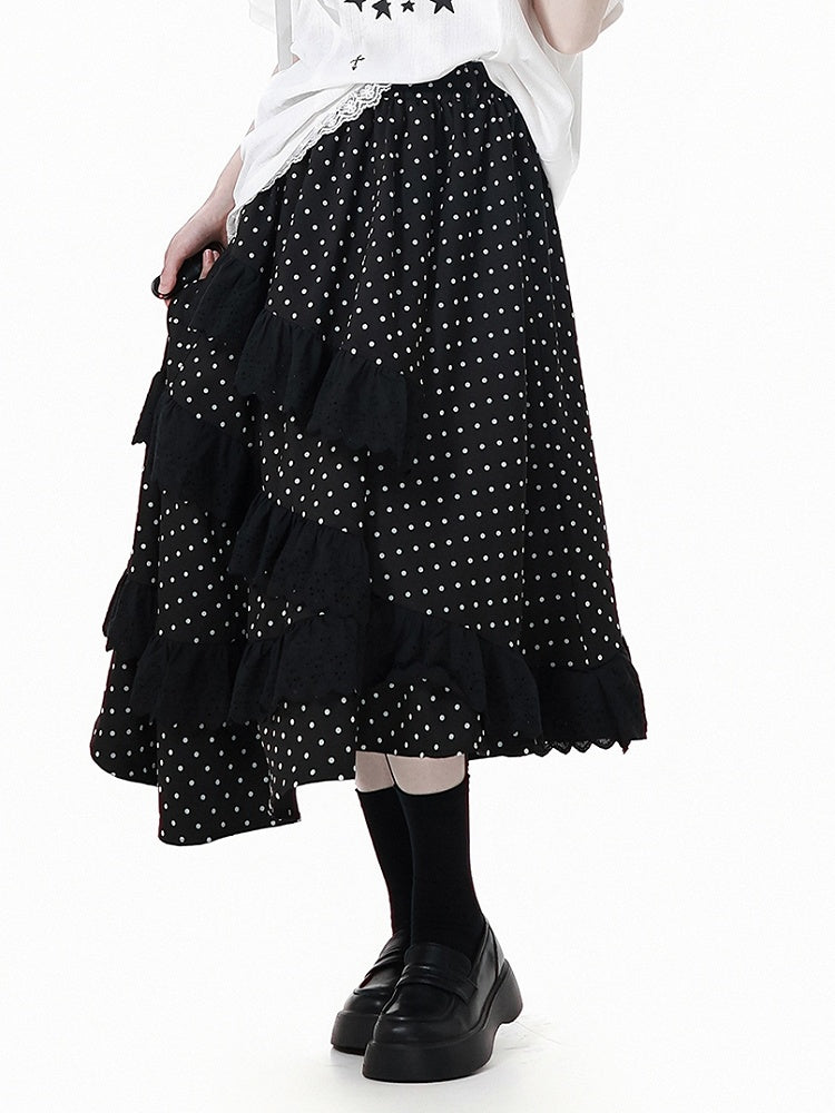 ブラックの伸縮性ウエスト、アシンメトリーレース、水玉模様のスカートトリム