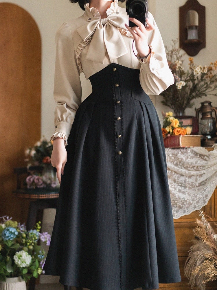 ヴィンテージ風の黒のロリータスカートは、ボーン入りのエレガントなハイウエストデザインで、体にぴったりフィットします。ミディ丈とストライプ柄が洗練された雰囲気を添えます。ワードローブに素敵な一着を加えて、あなたの内なるキュートさを引き出しましょう。