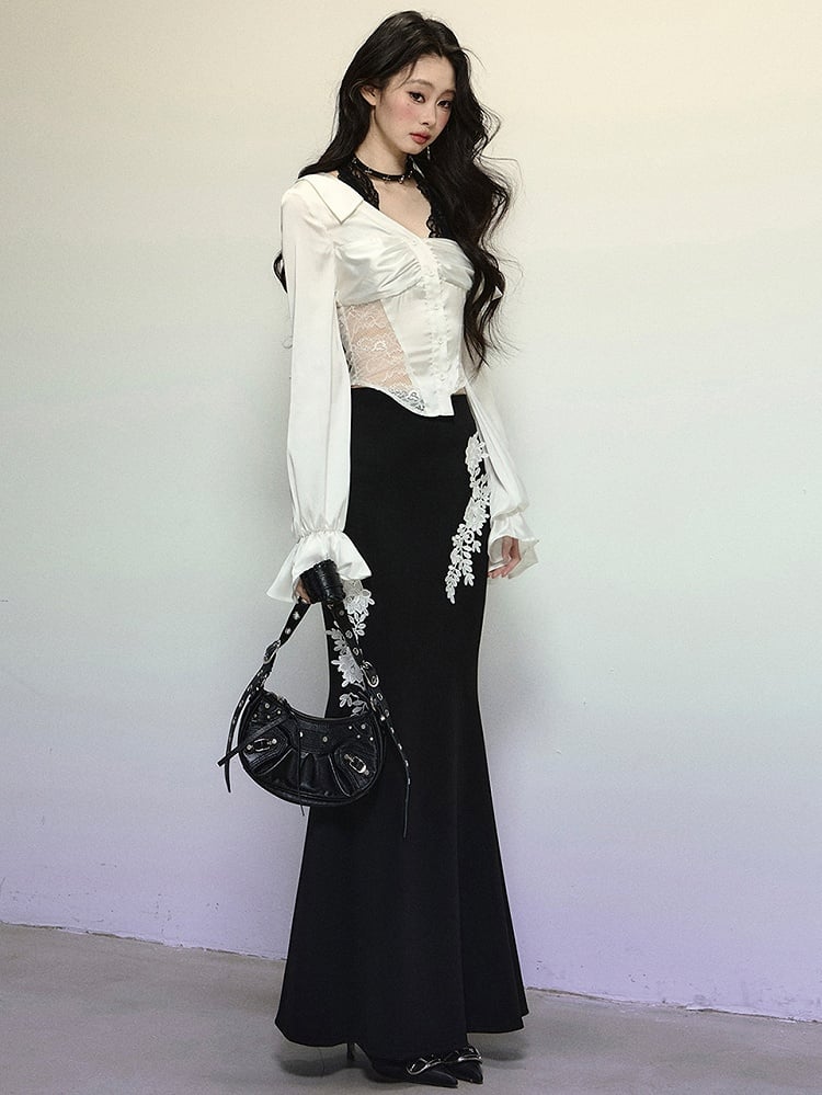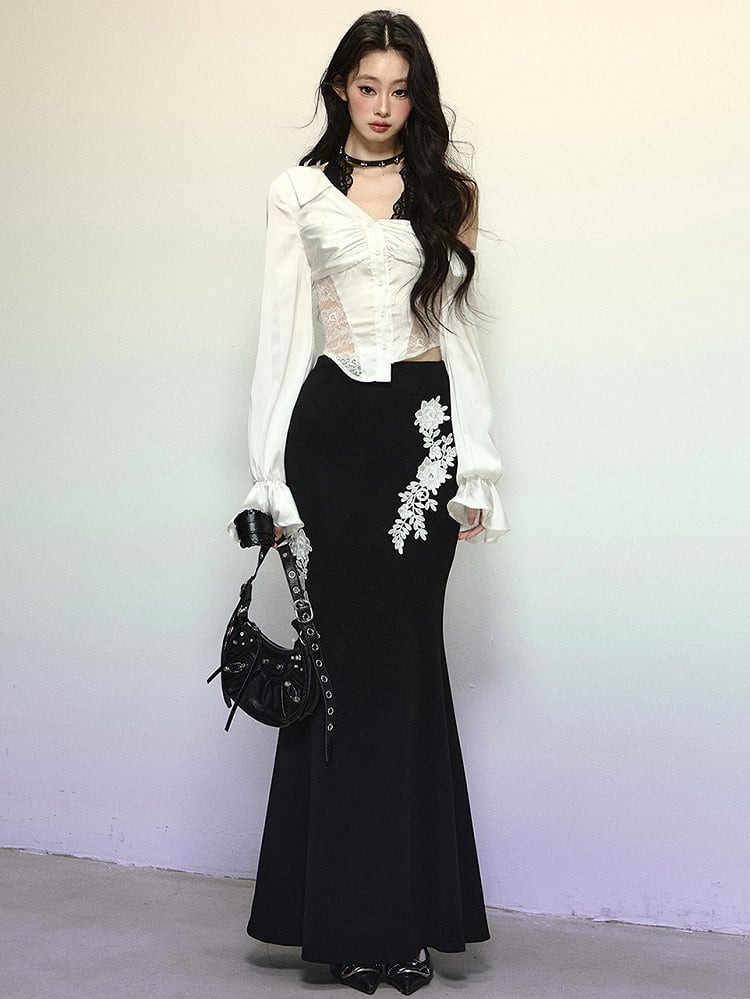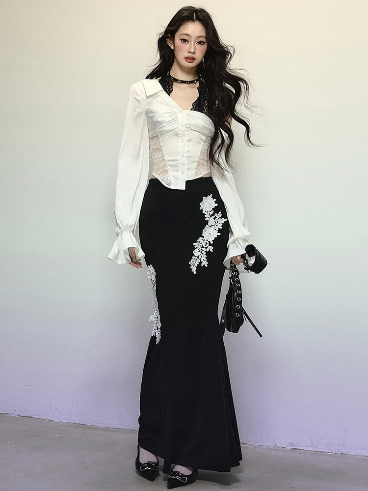ブラックフローラル刺繍ハイウエストマーメイドスカート