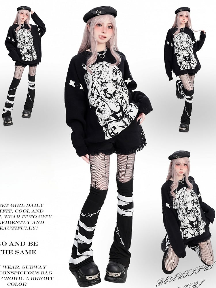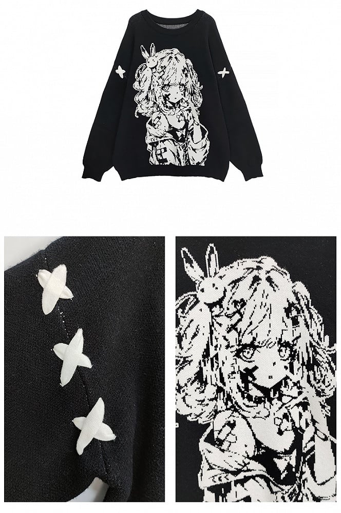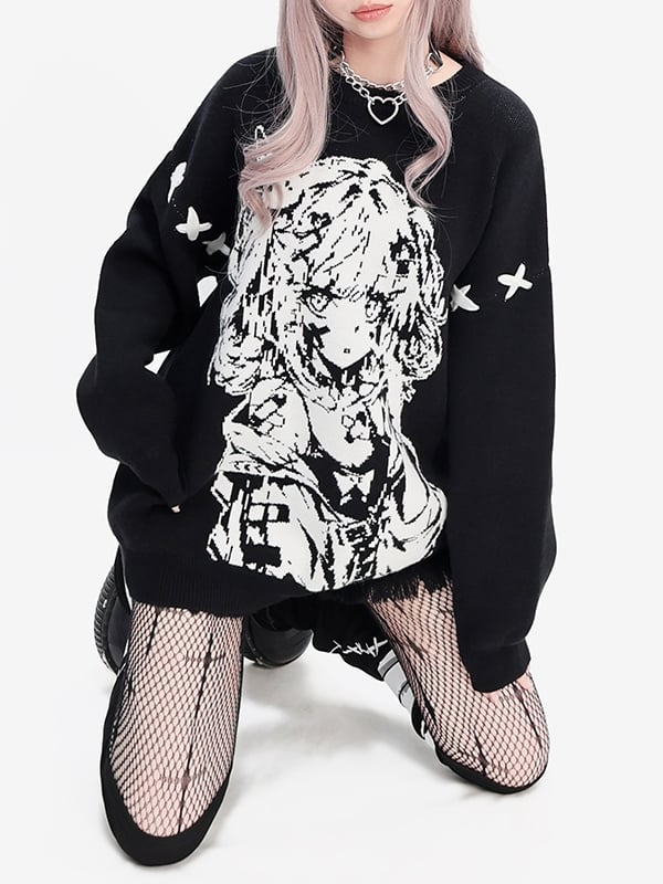 ブラックガール柄ラウンドネックルーズセーター