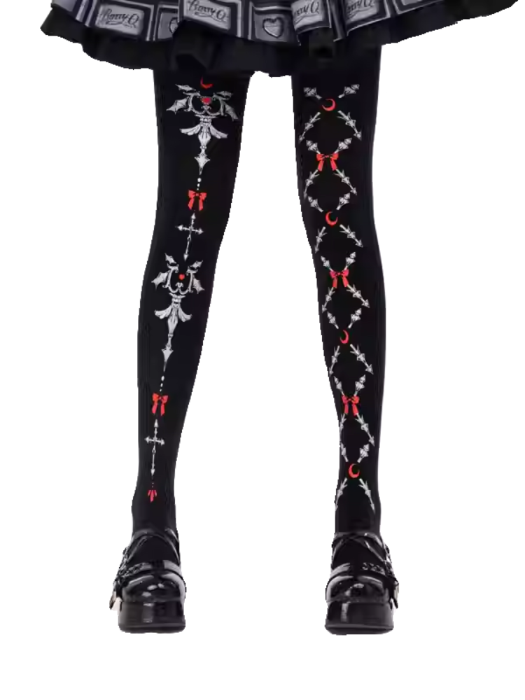 ブラックゴシックロリータレッドリボンプリントタイツ
