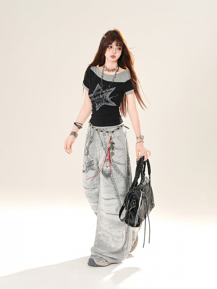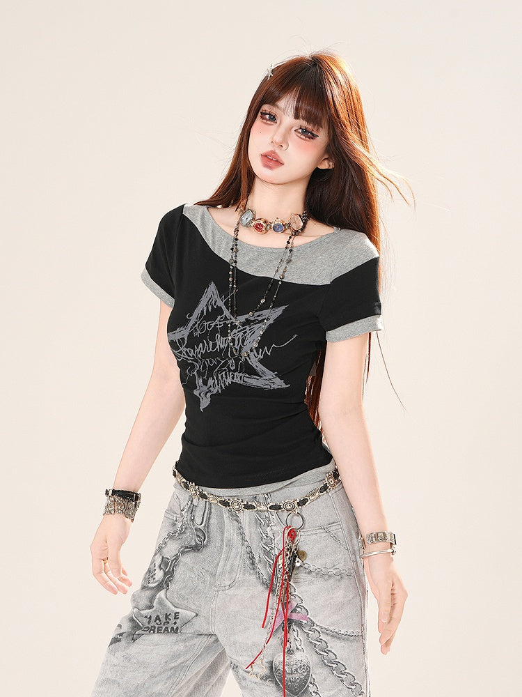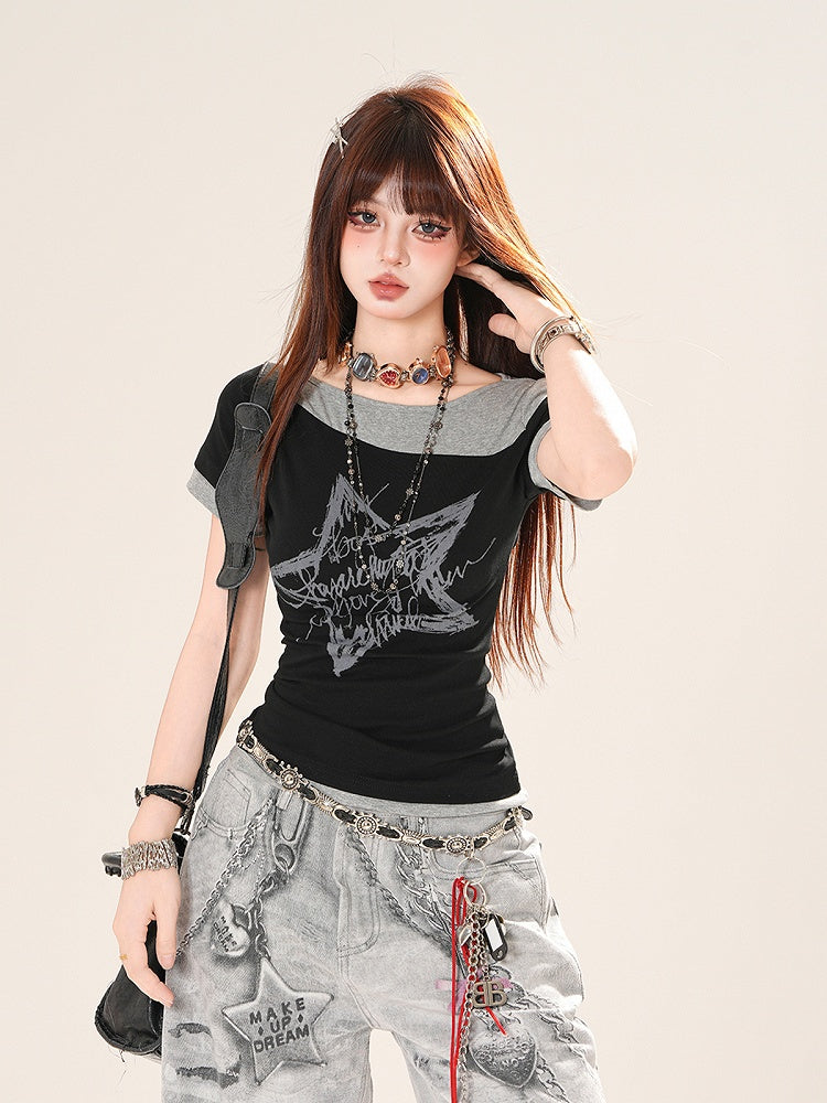ブラック&グレーのスタープリントフェイクツーピースTシャツ