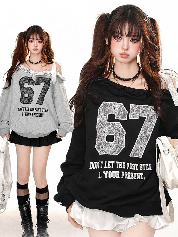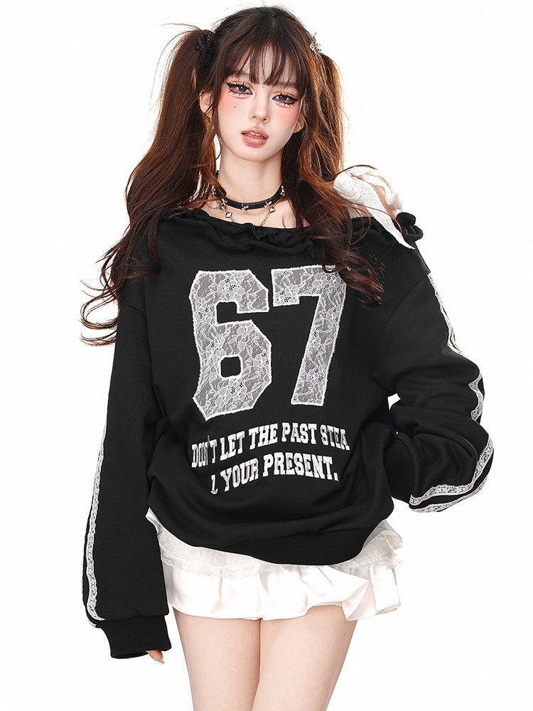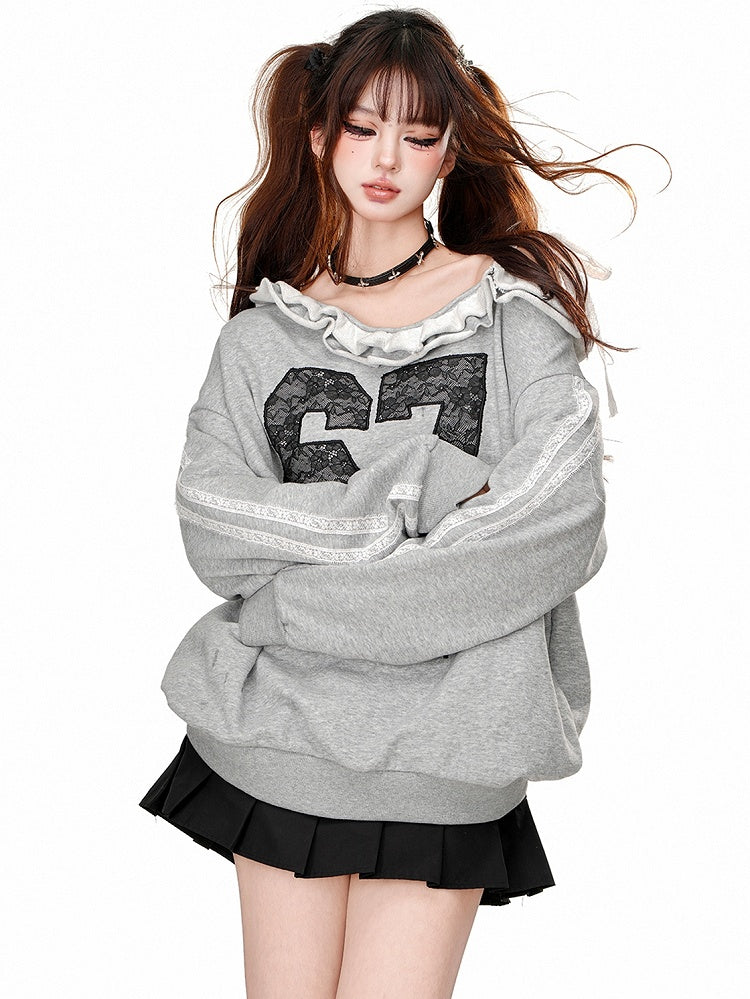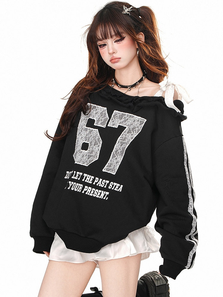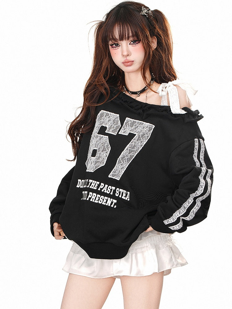 ブラック/グレー レースアップリケ アシンメトリーネックライン スウェットシャツ
