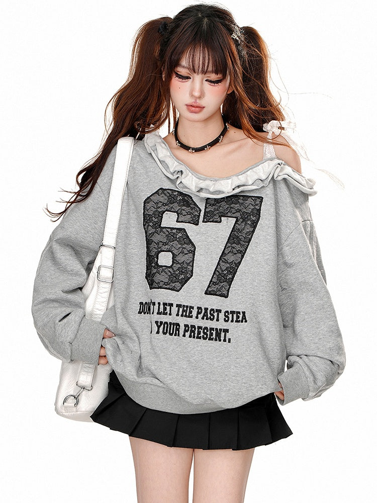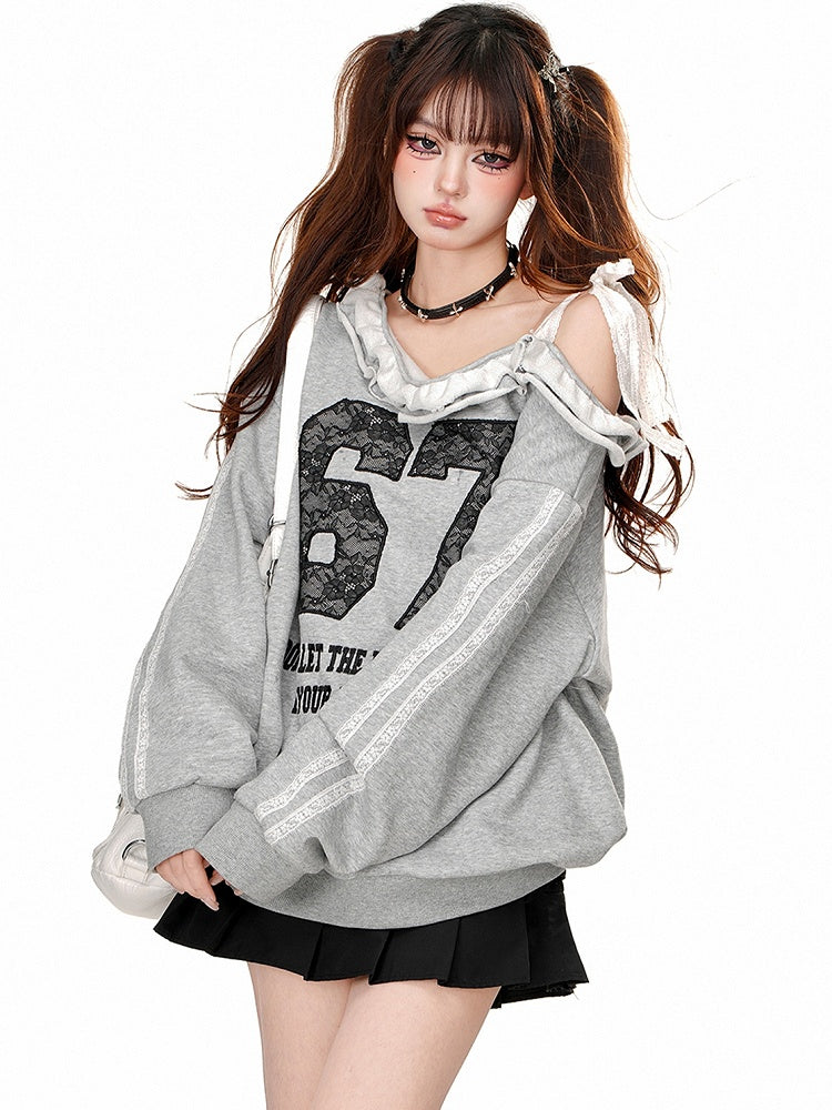 ユニークなアシンメトリーネックラインと愛らしいレースアップリケが特徴のスウェットシャツ。ワードローブにキュートなアクセントを添えます。着心地の良さとスタイリッシュさを兼ね備えています。