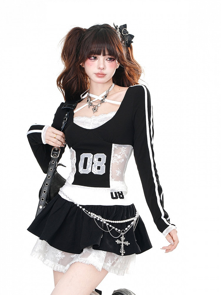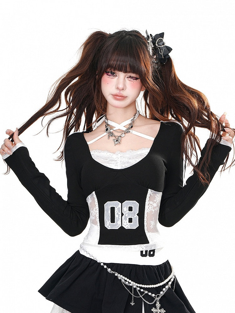 ブラックホルターネックコントラストレースパッチクロップドトップス