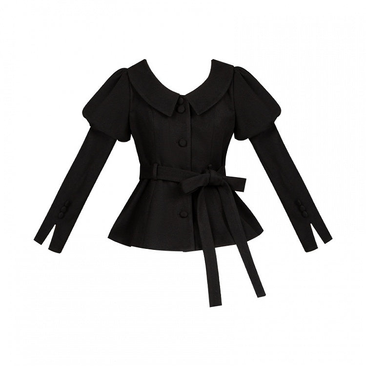 ブラック ジュリエットスリーブ ラウンドフラットカラー ロングスリーブコート