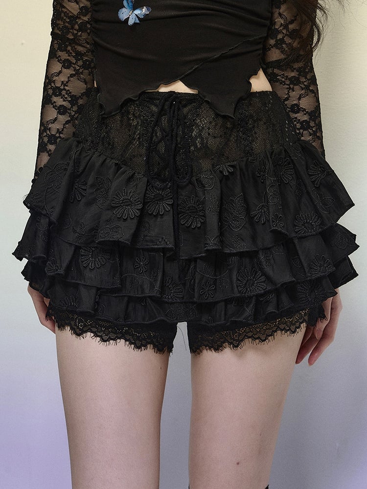 ブラックレースの花柄ハイウエストティアードミニスカートレースアップディテール