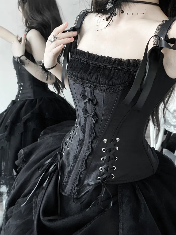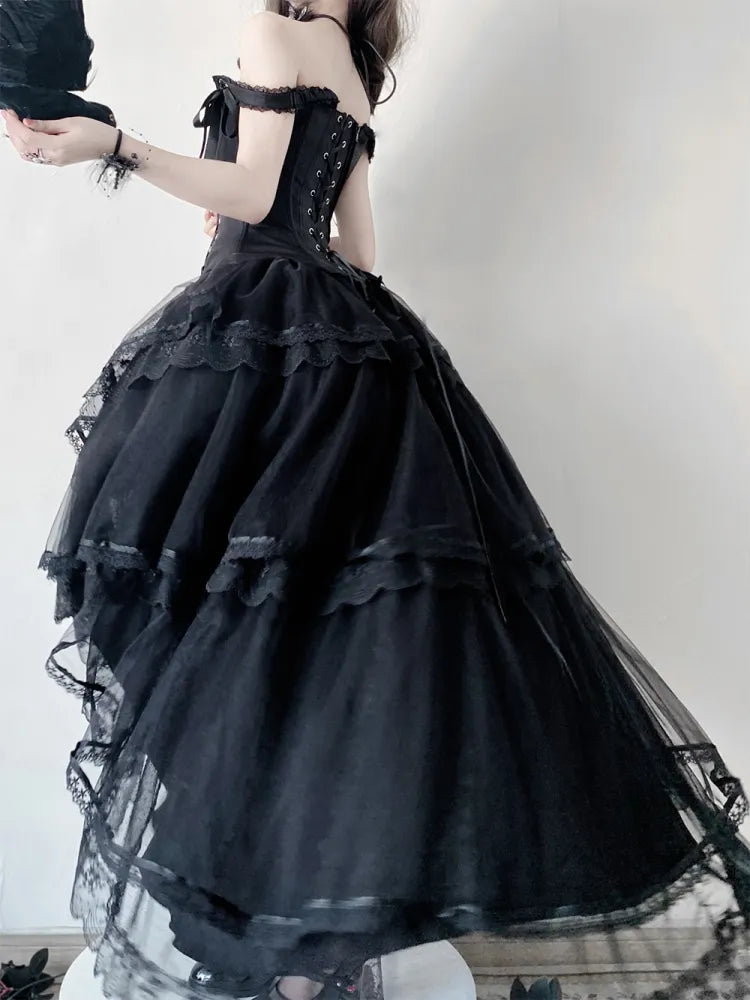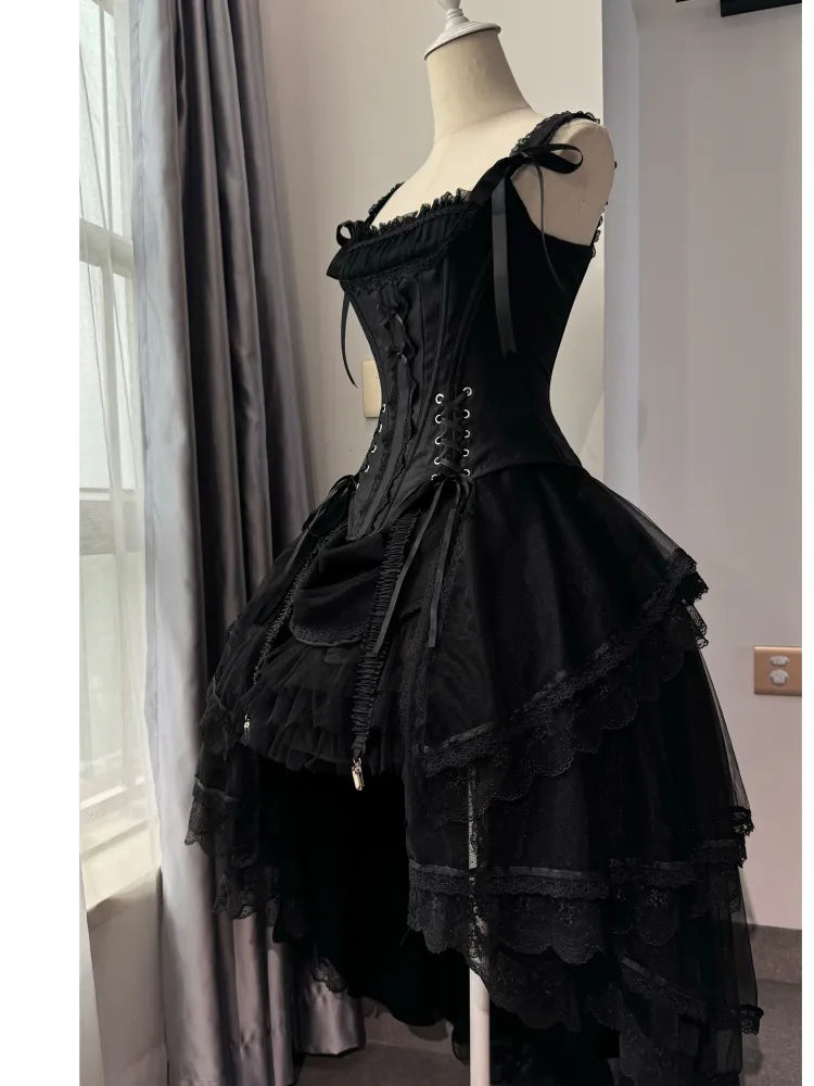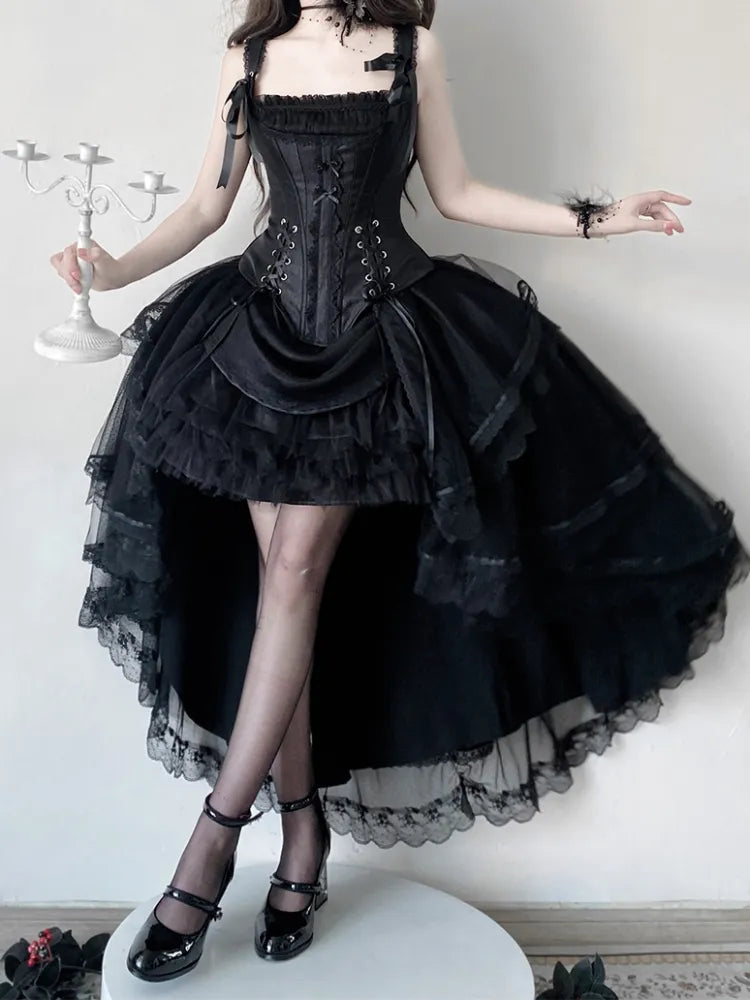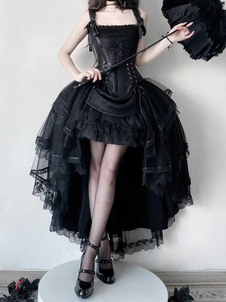 ブラックのレースアップディテールのボーン入りコルセットトップ + ハイローレイヤードロリータスカート