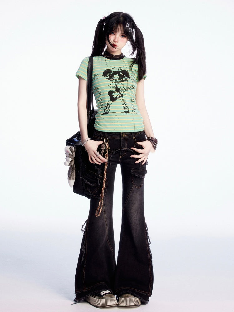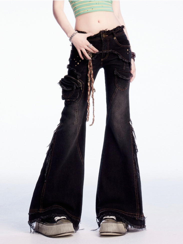ブラック ローウエスト 切りっぱなし裾 ヴィンテージ フレア カーゴジーンズ