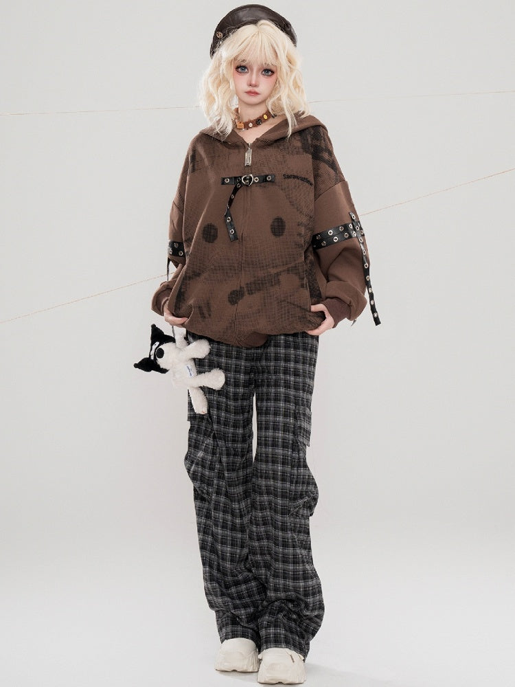 ブラックチェック柄カーゴポケットデザインストレートレッグカットパンツ