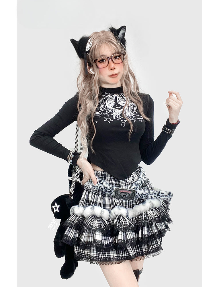 ブラックチェック柄レーストリムティアードスカート