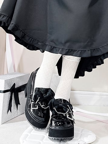 ブラックポリッシュクロス装飾ボウケイラインストーンプラットフォームバックルローファージライチェーン