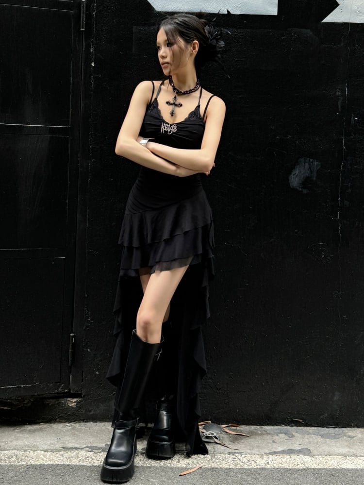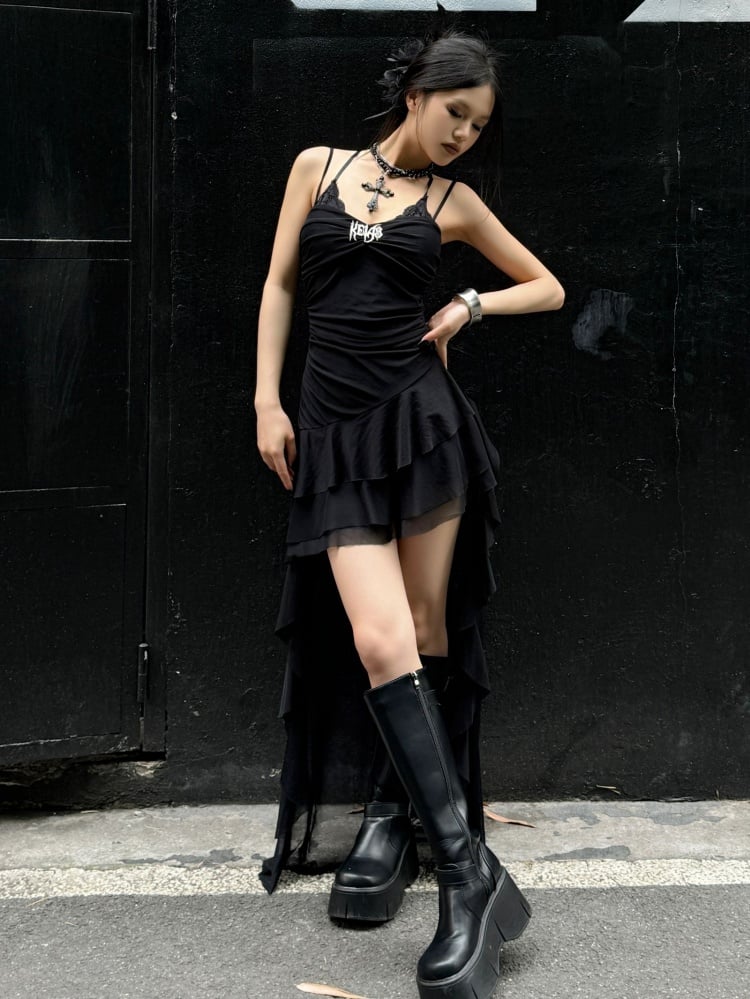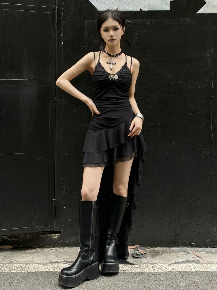 シックでエッジの効いた、ブラックパンクロックサマースパゲッティストラップドレスは、どんな人混みの中でもあなたを際立たせます。体にぴったりフィットし、涼しげな夏の雰囲気を醸し出すこのドレスは、お気に入りのアクセサリーとの組み合わせに最適です。このマストハブドレスで、あなたの内なるロッカーを解き放ちましょう。