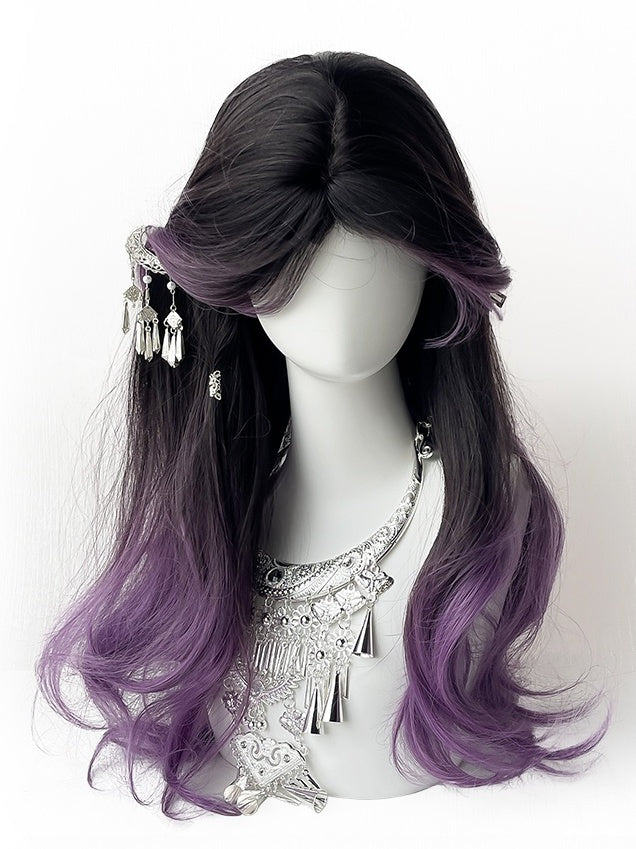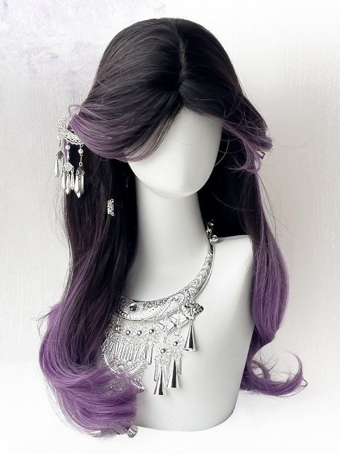 黒紫のオンブレロングウェーブ合成ウィッグ(カーテンバング付き)