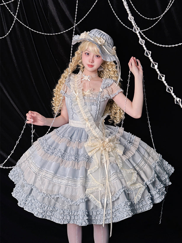 青と白のオールドスクールロリータファッションドレス 蝶結びディテール JSK セット