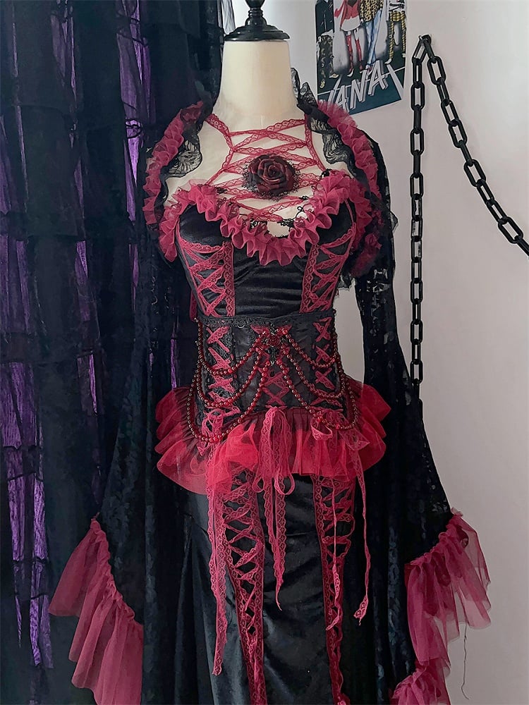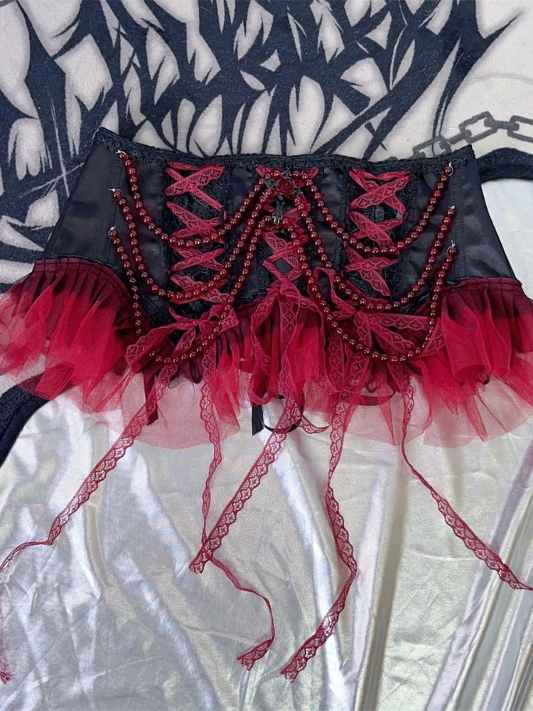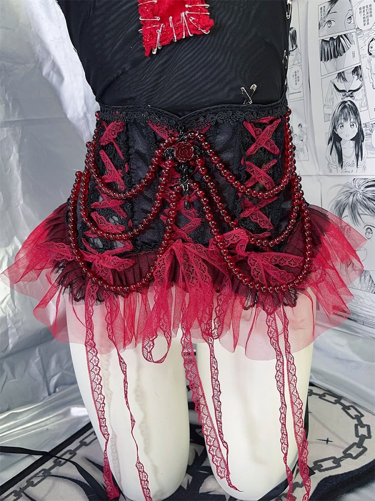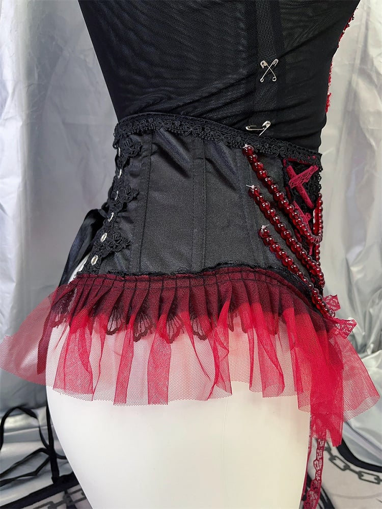 ブラックレッドレーストリムゴスコルセットベルト(ビーズチェーン付き)