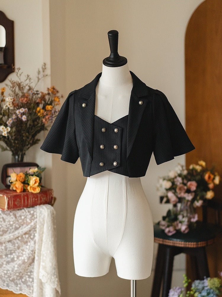 ブラックのレトロファッションブレザーカラークロップドトップ