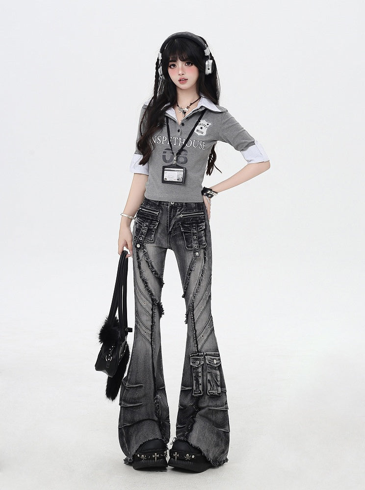 ブラック ライズ ロウヘム フェードウォッシュ フレア カーゴジーンズ Y2K ロー